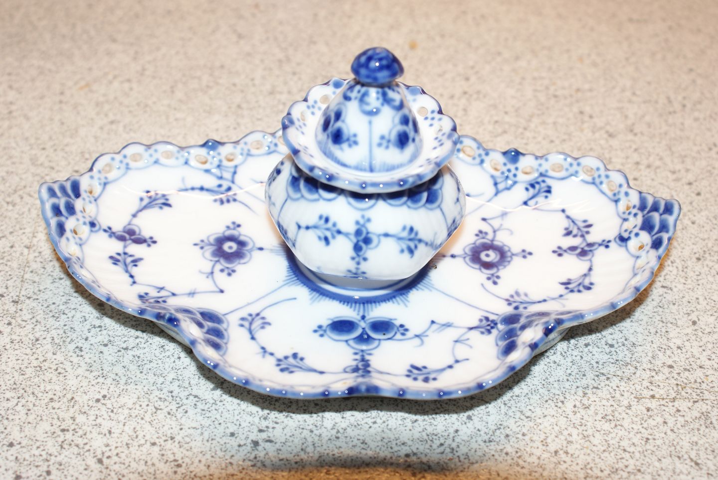 Royal Copenhagen Blue Fluted Full Lace, Writing set with solid inkwells Produced between 1898-1922 Dek. No. 1/1064 1st quality Measures 17 x 10 cm. Beautiful and well maintained.