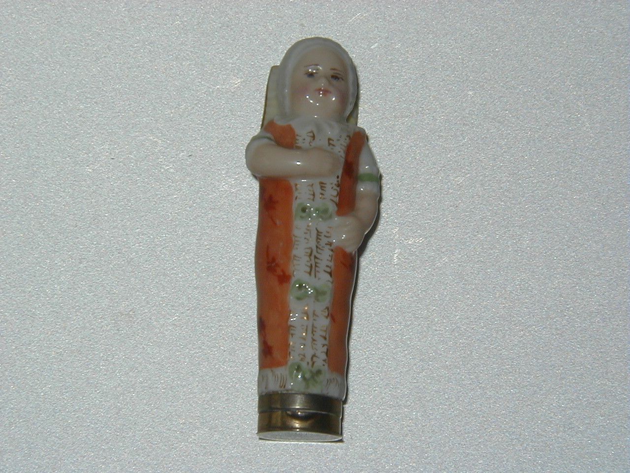 Antik Kongelig Figur, som formentlig har været brugt til lugteflaske. Denne type kaldes svøbelsesbarn. De er produceret lige omkring 1780. Højde 9 cm. 1. sortering. Perfekt stand.