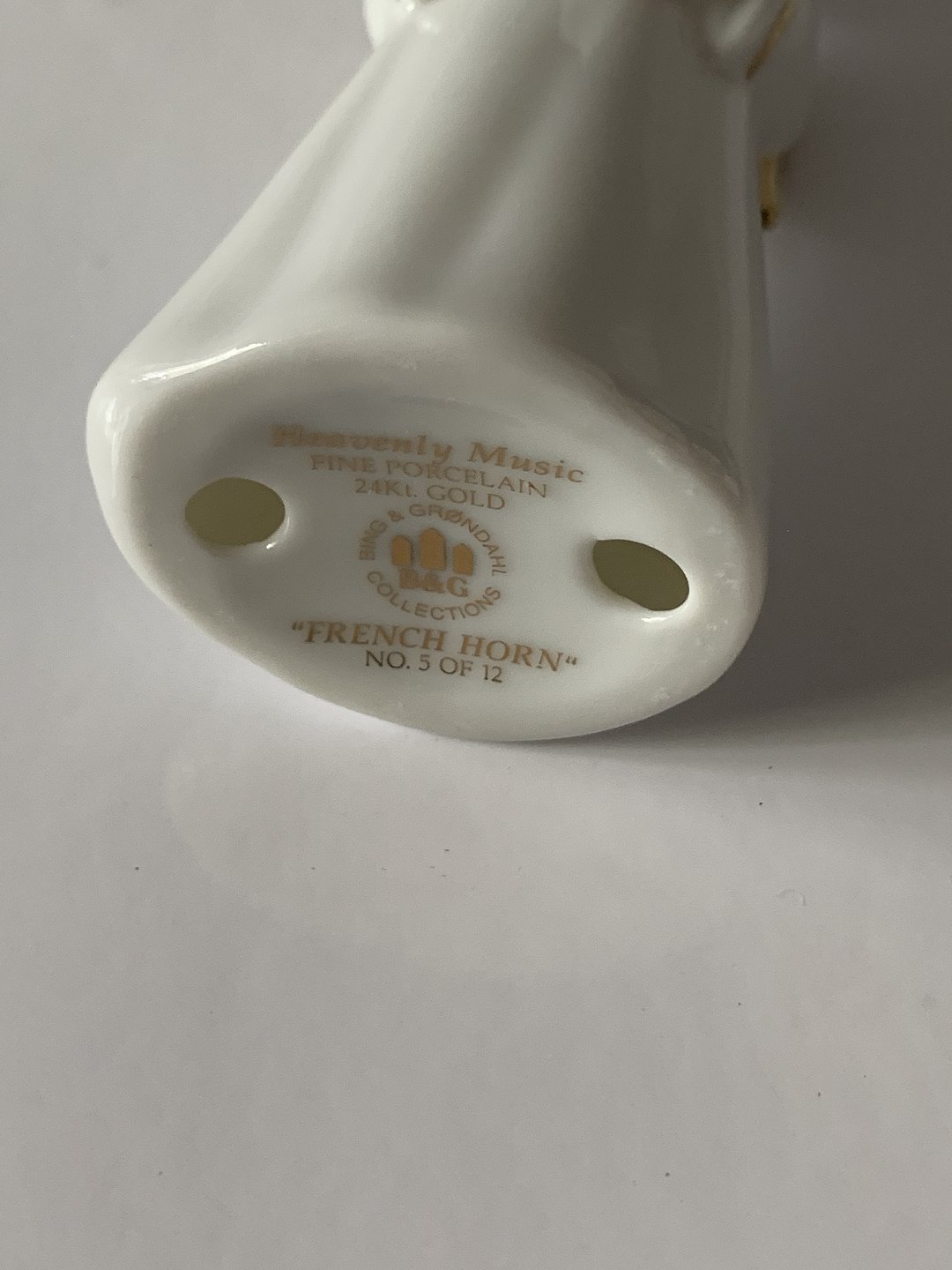 Bing & Grøndahl. Heavenly Music. French Horn No. 5 af 12. Hvid porcelæns engel med guld staffering og guldvinger (24 karat). Serien hedder " Engel med Instrumenter" og består af 12 stk.