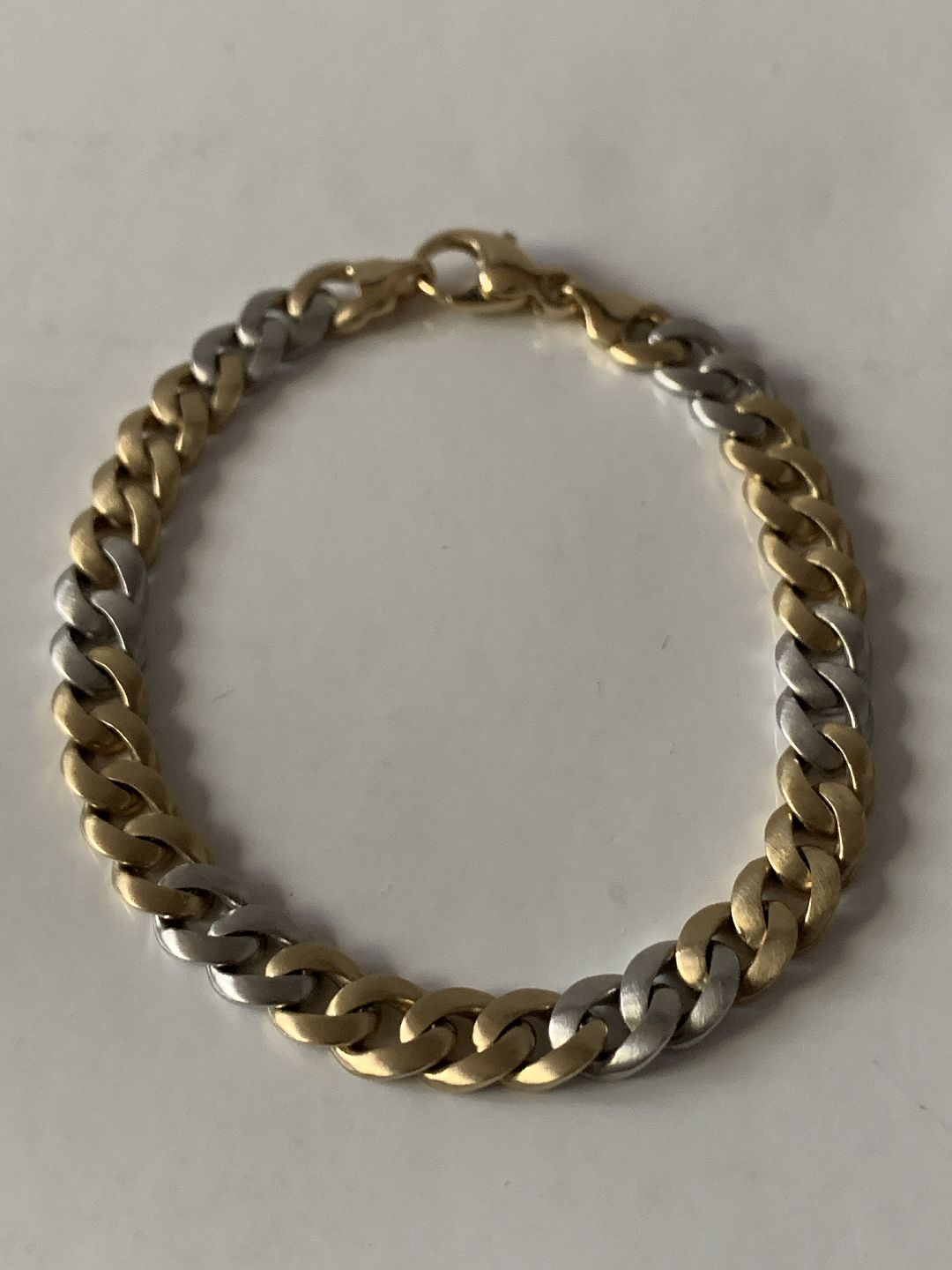 Very nice and elegant gold bracelet, in combined red and white gold. This combination gives the bracelet great dynamism and life when worn on the wrist. As an extra detail, the bracelet is polished on one side and brushed on the other. This enables two identities in the bracelet that can be combined with the outfit. A very beautiful bracelet that can be used for both everyday and festive occasions.