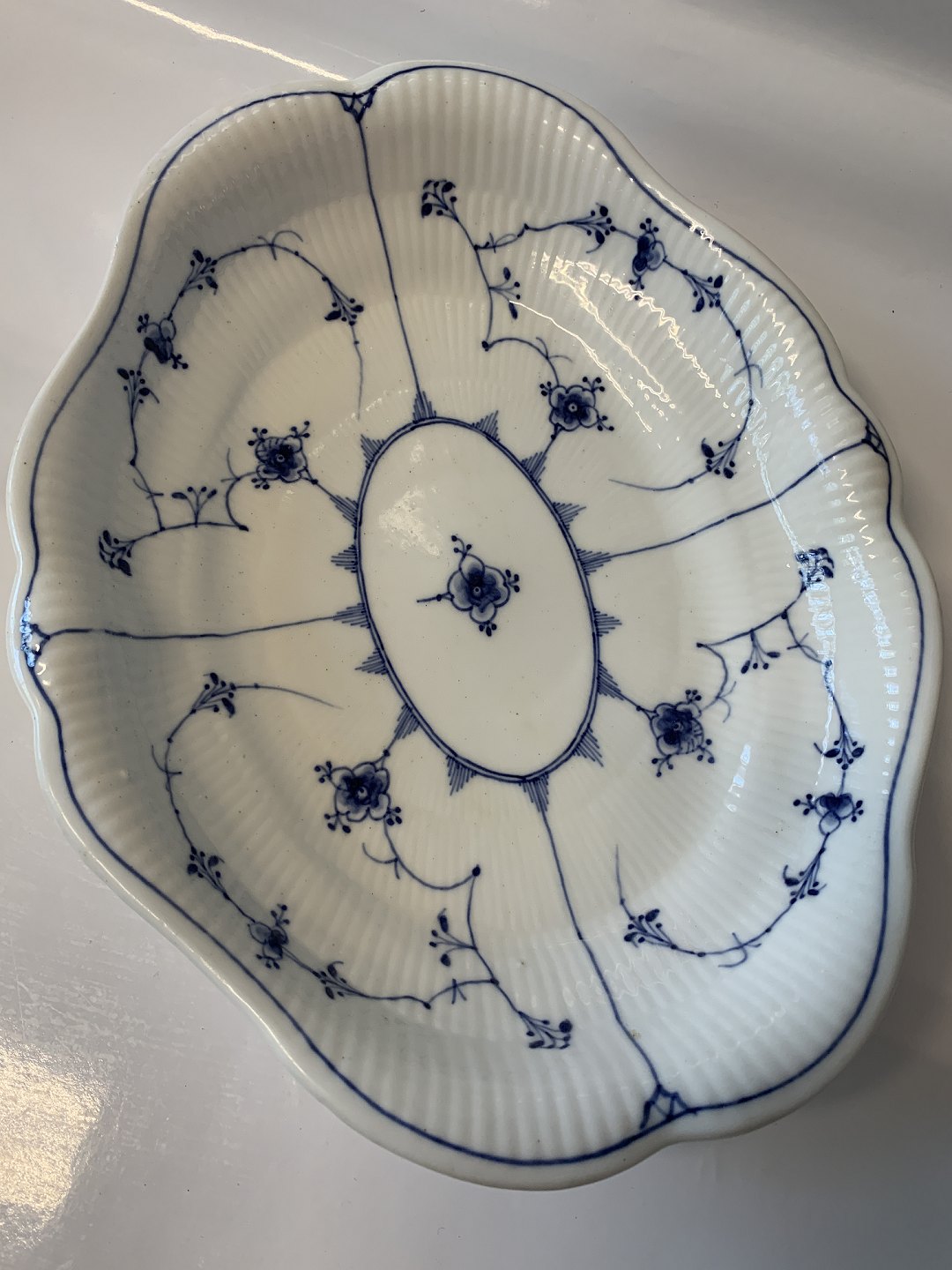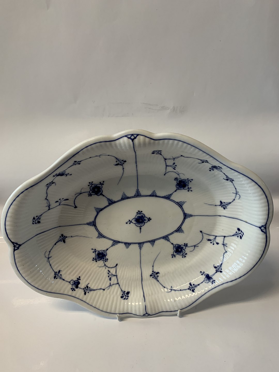 Royal Copenhagen Blue Fluted Fluted, rare bread tray. 1st grade. Produced before 1894. The tray measures 30.7 x 24,5 cm. Dots in the glaze and bubbles see photo, otherwise nice and well-kept condition.