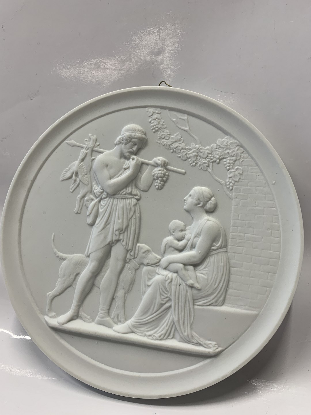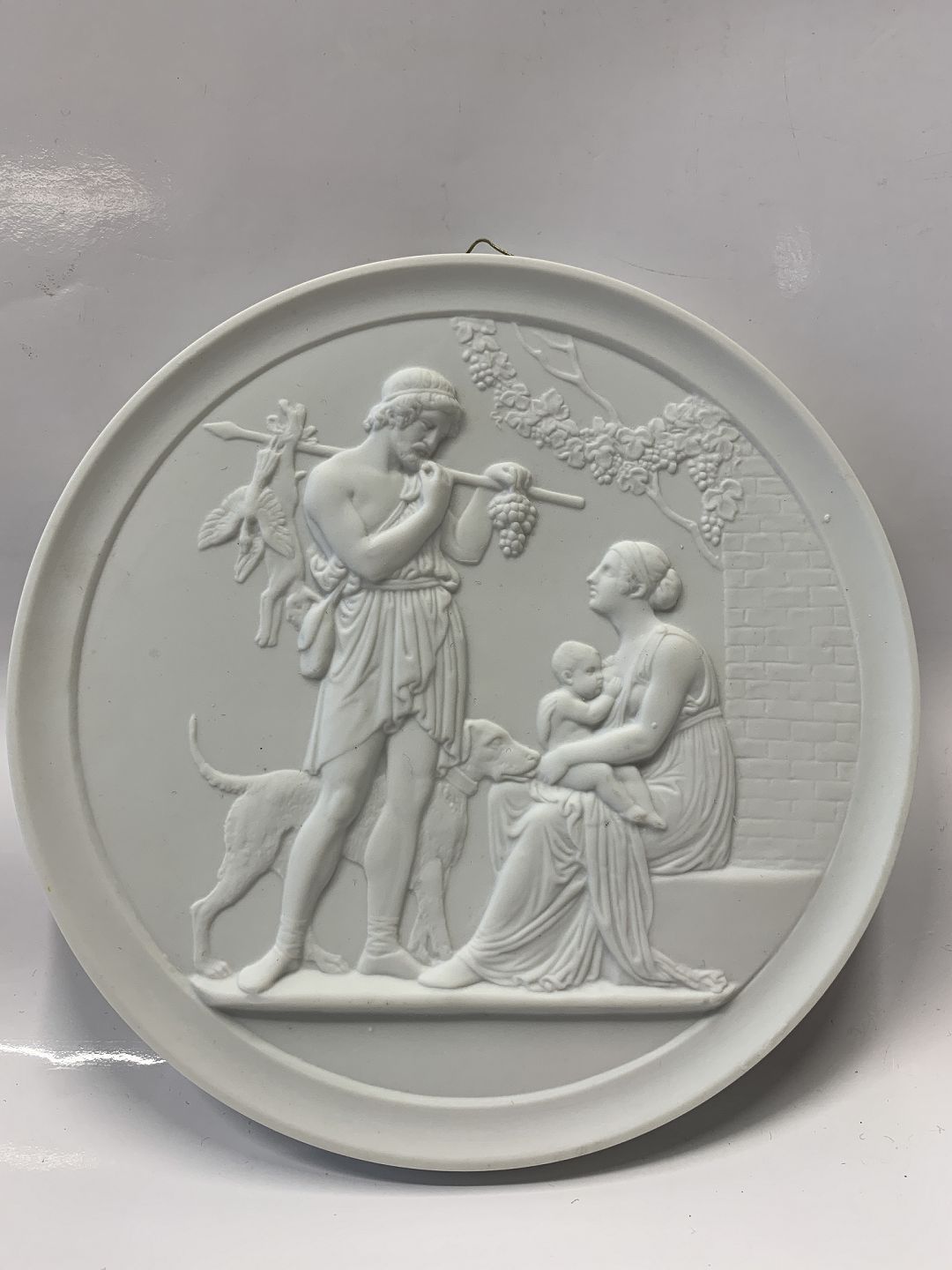 Royal Copenhagen Bisquit platte af Thorvaldsen "Mandom og efterår" Stemplet "Royal Copenhagen ENERET". 1. sortering. Måler 14 cm. Pæn og velholdt.