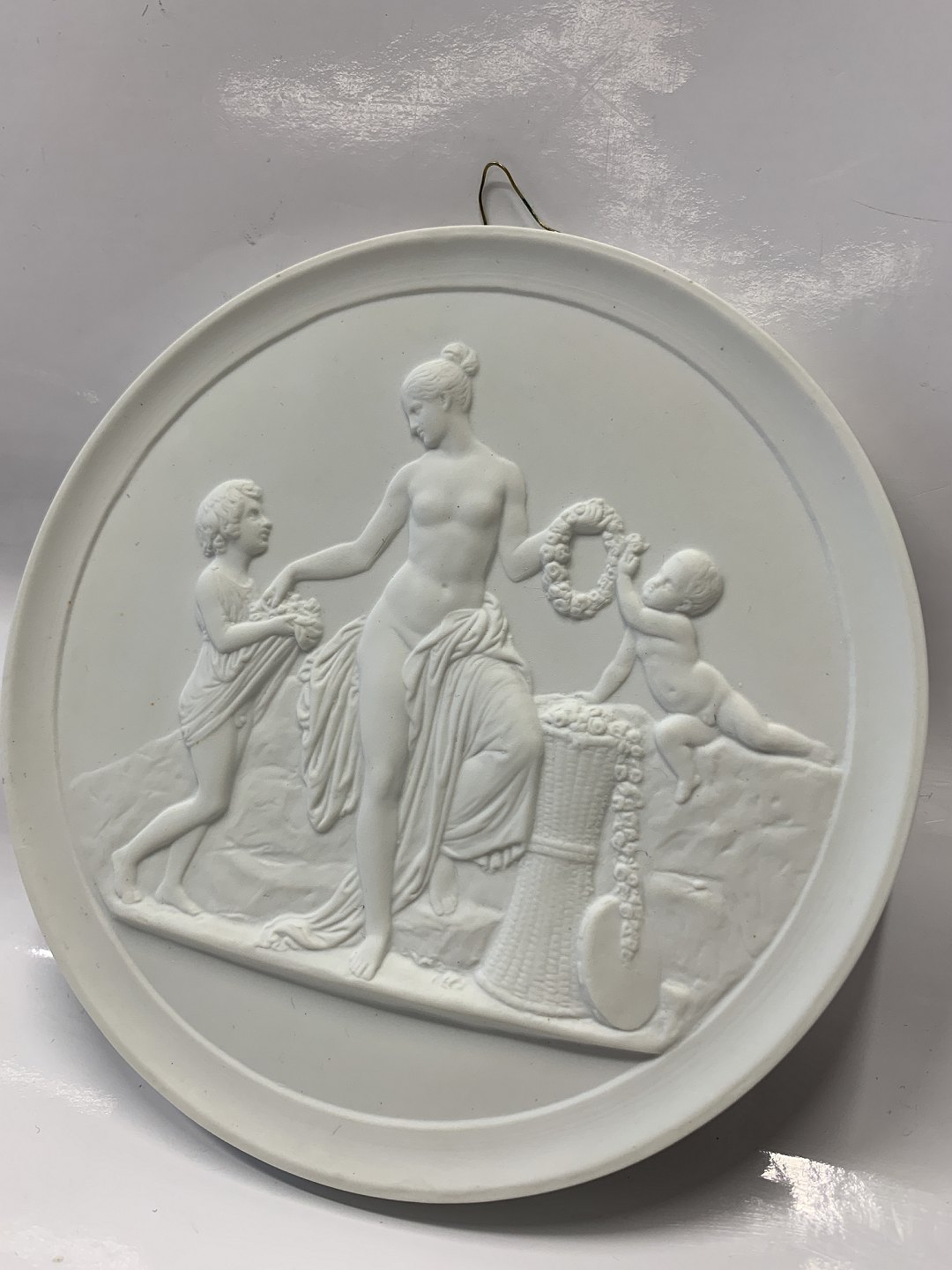 Royal Copenhagen Bisquit plate by Thorvaldsen "Childhood and Spring." Stamped "Royal Copenhagen ENERET". 1st grade. Measures 14 cm. Neat and well maintained.