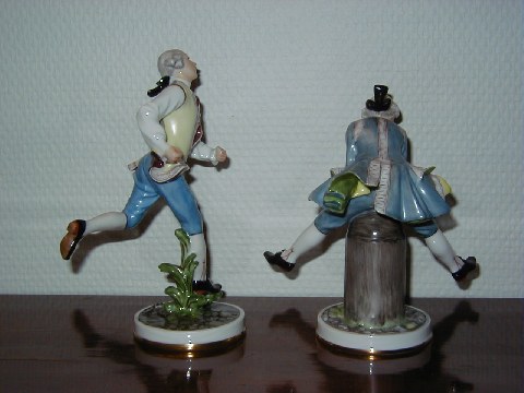 Bing & Grondahl Overglaze Figures by Hans Tegner and Jens Jacob Bregno. To the left with decoration number 8028, height 16 cm., to the right decoration number 8029,Sold height 14.5 cm. Both are factory first and both in perfect condition.