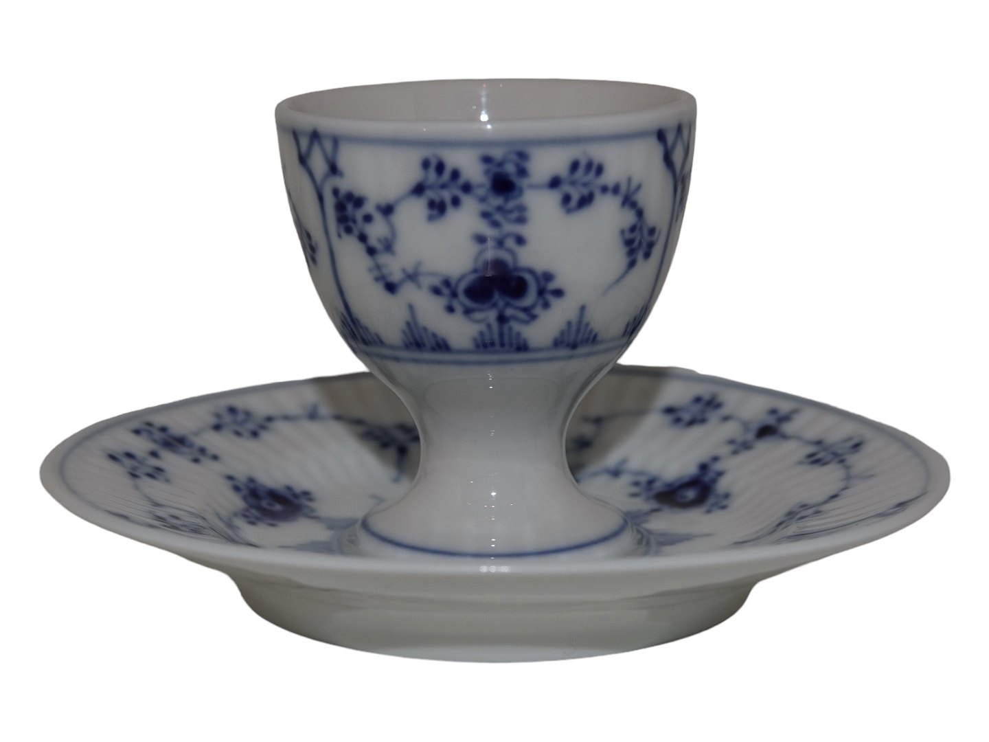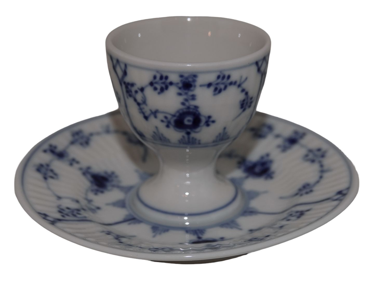 Royal Copenhagen Blue Fluted Plain, rare egg cup with fixed plate. Decoration number 1/117. Factory second. Height 6.0 cm., diameter on plate 11.0 cm. Perfect condition with no chips, cracks or repairs.