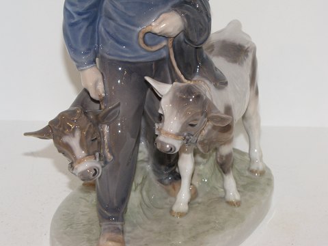 Stor Royal Copenhagen figur, dreng med to kalve. Stemplerne viser, at denne er produceret i mellem 1969 og 1974. Dekorationsnummer 1858. 2. sortering. Højde 23 cm., længde 18 cm. Perfekt stand uden fejl.