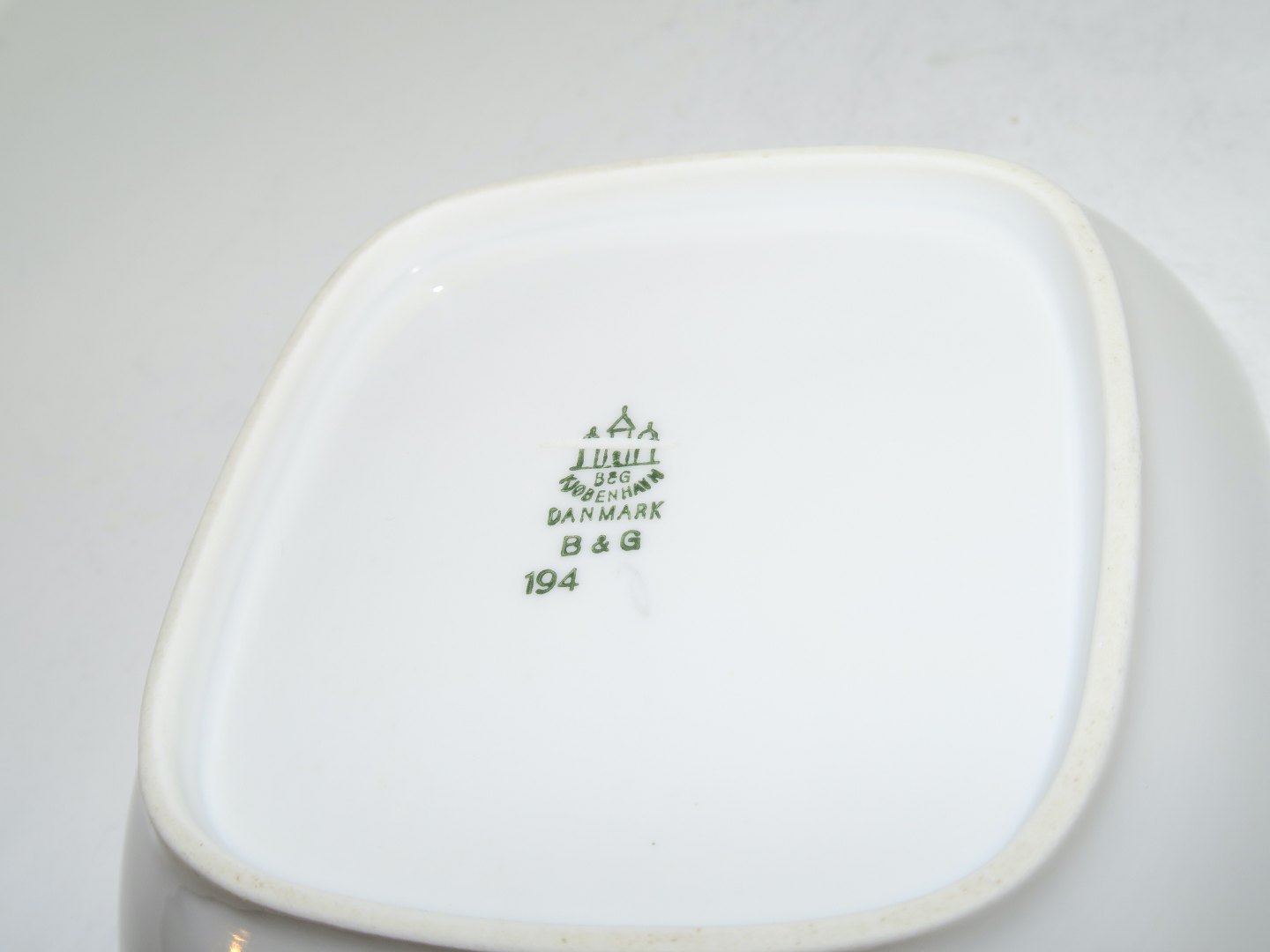 Bing & Grøndahl Måge uden guldkant, lille firkantet asiet. Stemplerne viser, at denne er fra mellem 1962 og 1970. Dekorationsnummer 194. 2. sortering. Måler 11,0 x 11,0 cm. Perfekt stand uden fejl.