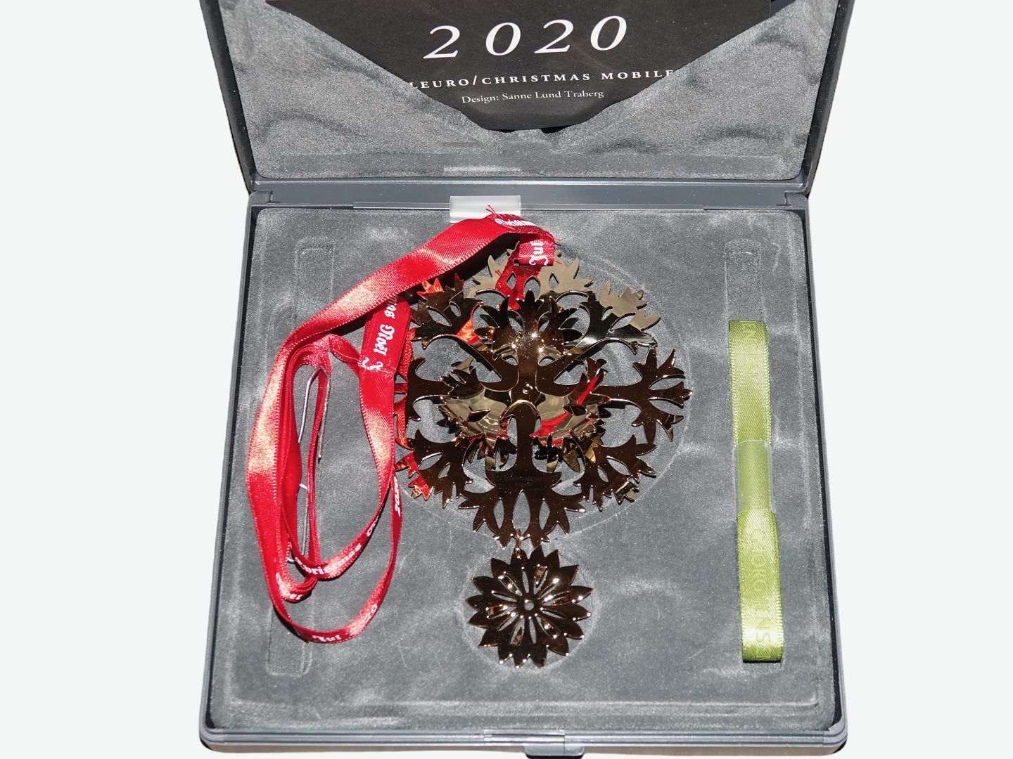 Georg Jensen Juleuro årgang 2020. Messing belagt med 24 karat bladguld. Ligger i original æske med tilhørende bånd. Der er skrevet "2020" med sort tusch på æsken. Meget velholdt og fejlfri stand.