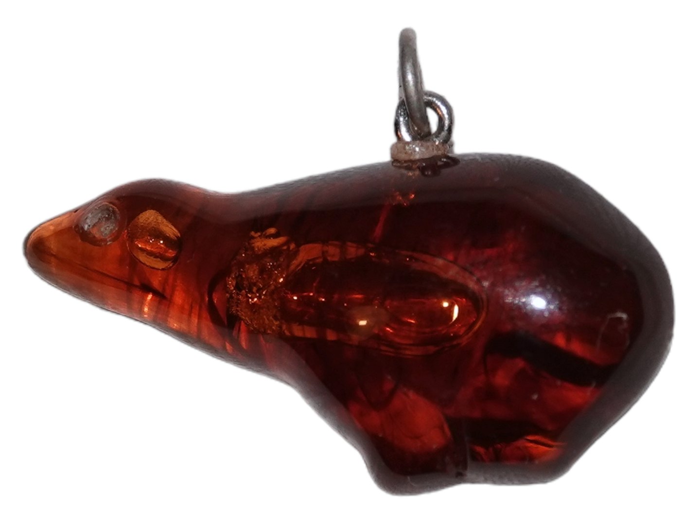 Rav vedhæng i form af isbjørn med sølvmontering.