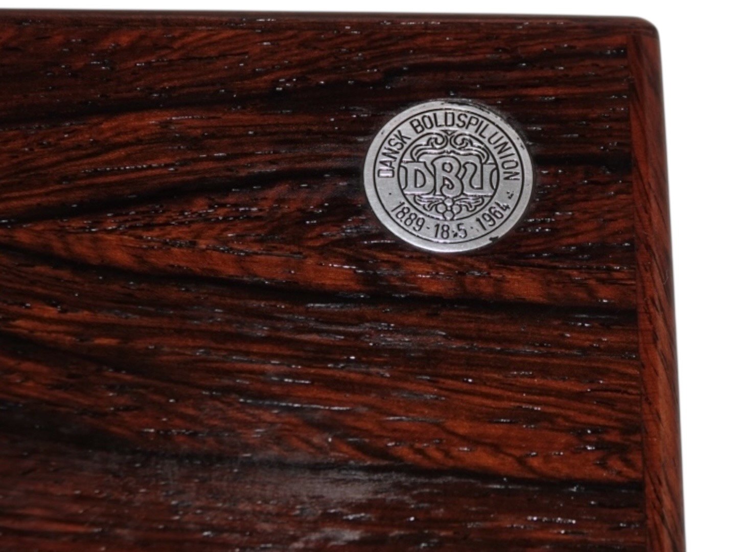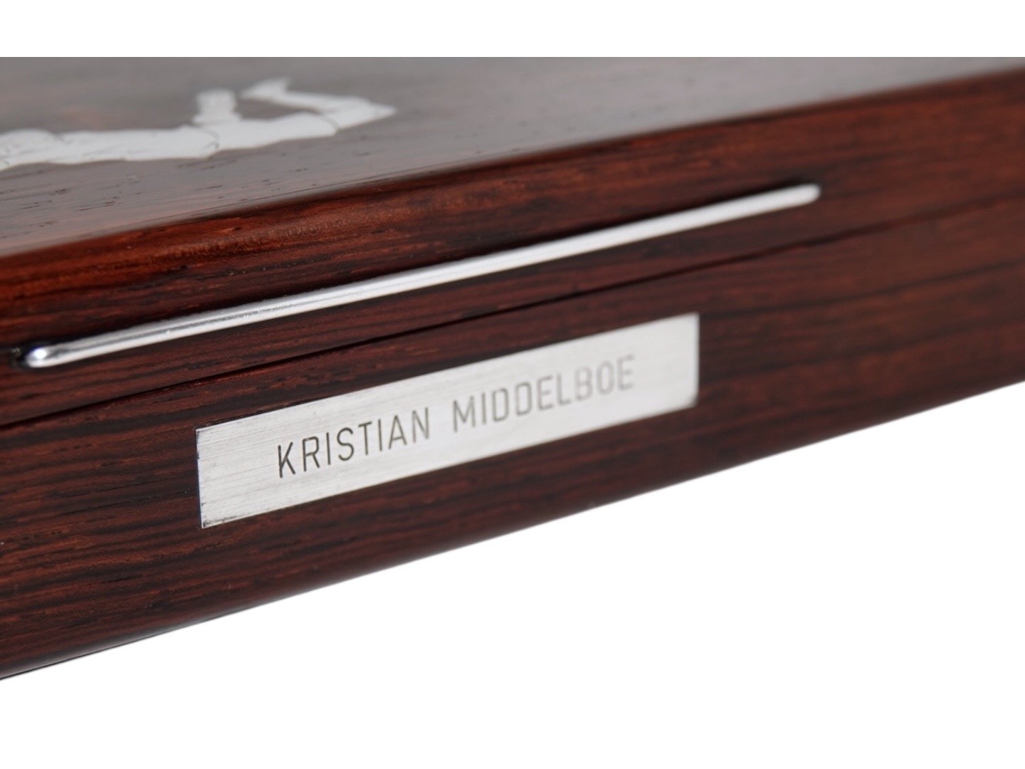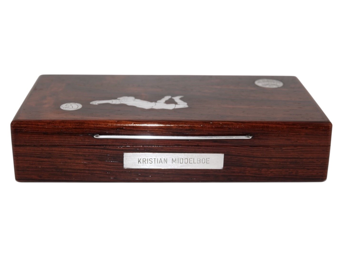 Rosewood box with silver and soccer player. Dedicated to Kristian Middelboe who was a soccer player and later became the chairman of DBU (Dansk Boldspil Union). A small newspaper article comes along.