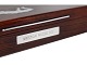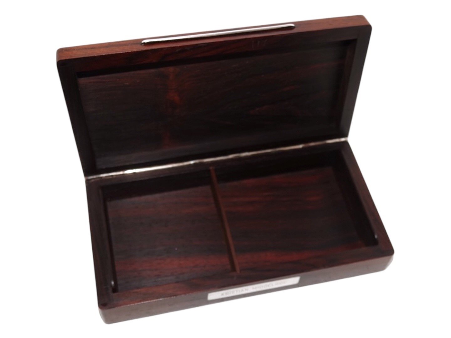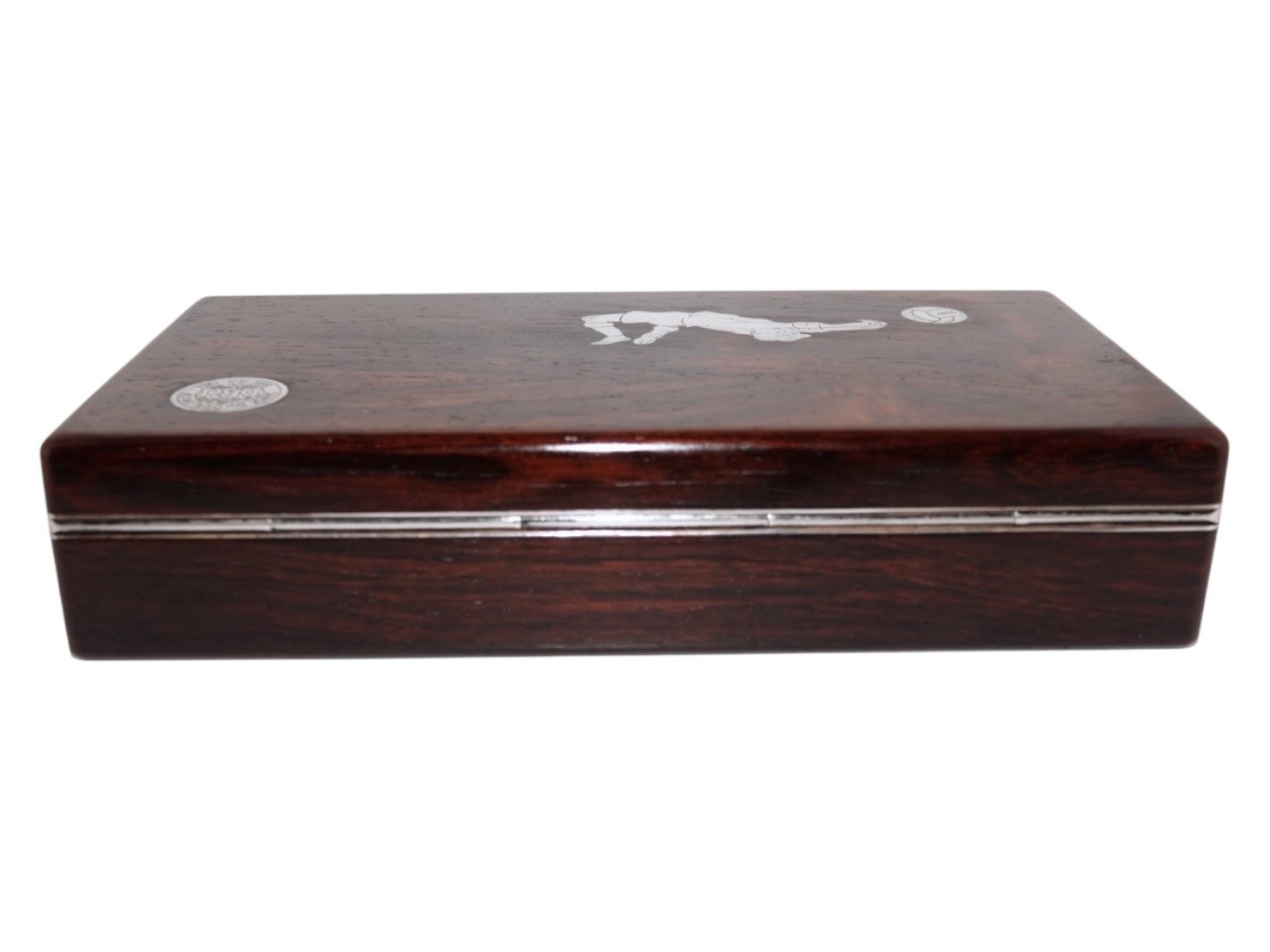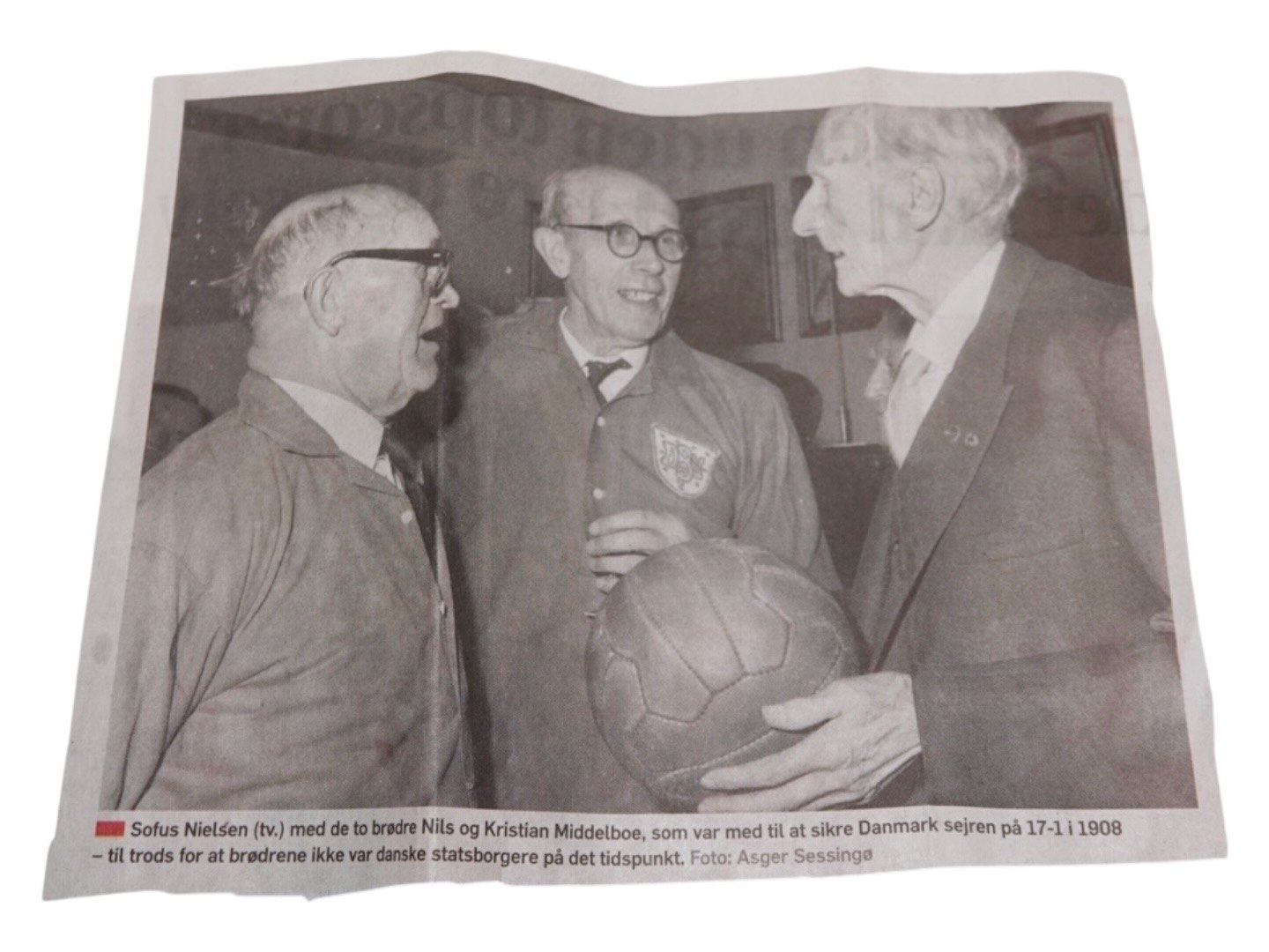 Rosewood box with silver and soccer player. Dedicated to Kristian Middelboe who was a soccer player and later became the chairman of DBU (Dansk Boldspil Union). A small newspaper article comes along.