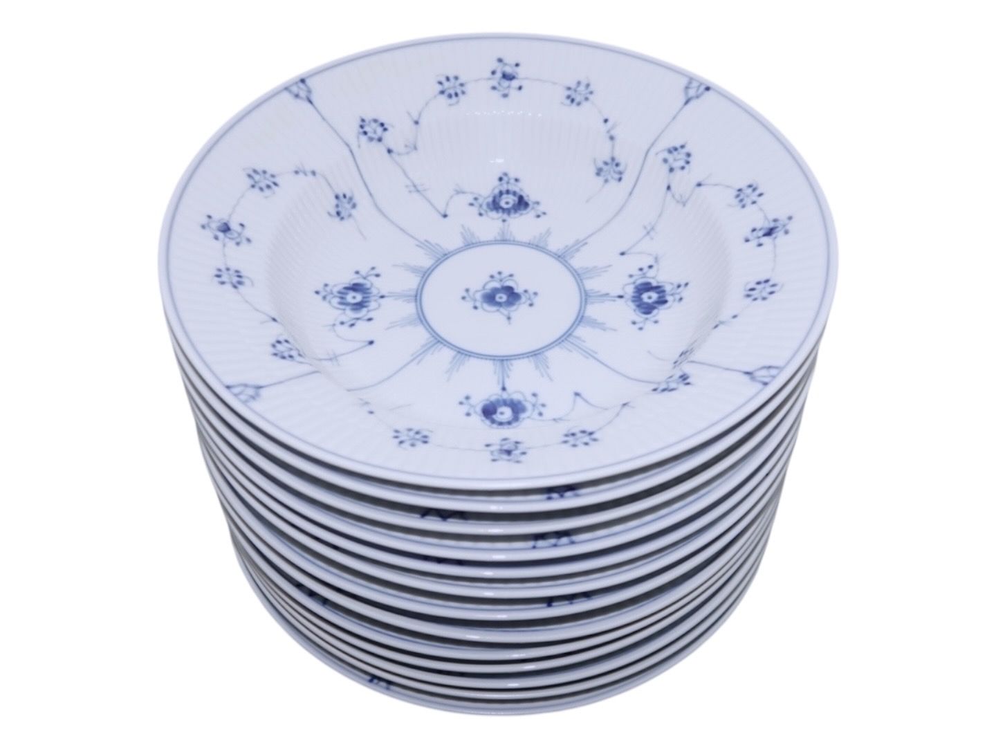 Royal Copenhagen Musselmalet Riflet, dyb tallerken. Dekorationsnummer 605. 2. sortering. Diameter 23,5 cm. Perfekt stand uden fejl.