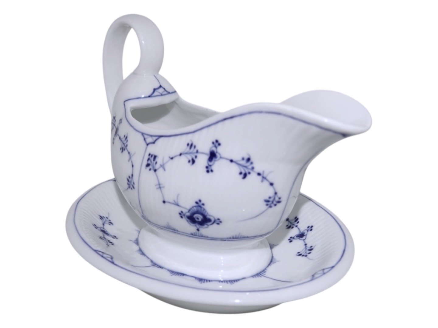 Royal Copenhagen Musselmalet Riflet sovseskål på fast underfad og med hank.