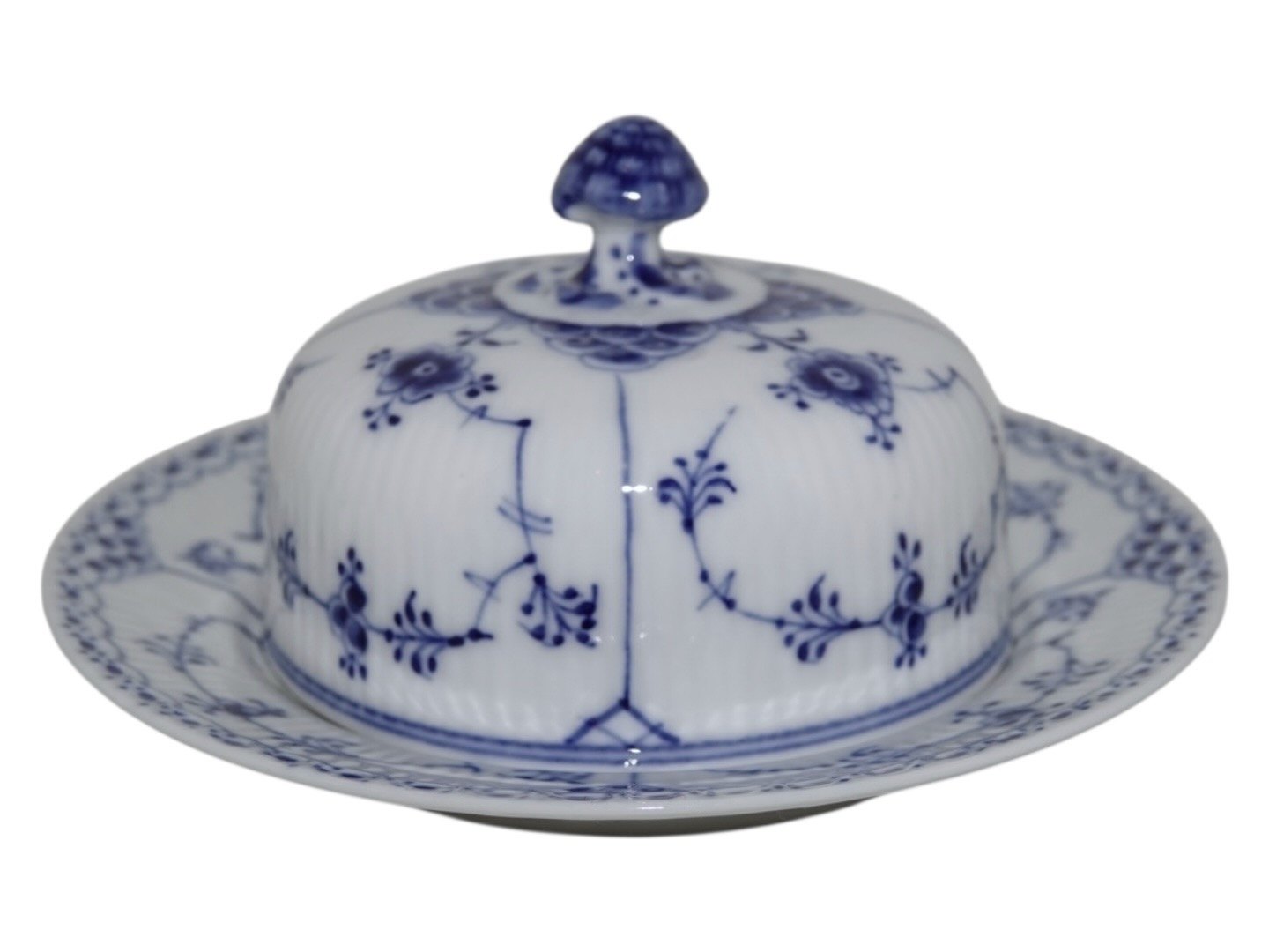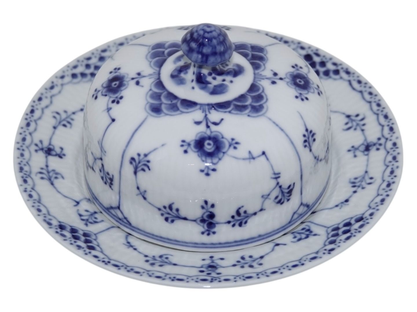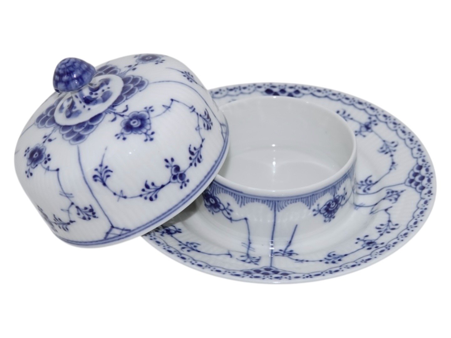 Royal Copenhagen Blue Fluted Half Lace, lidded bowl for butter with platter.