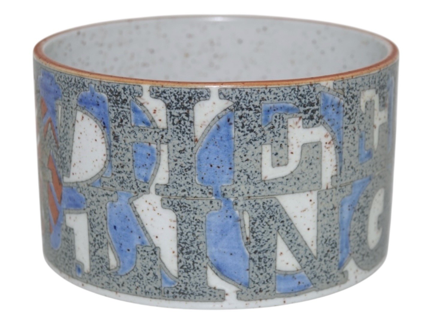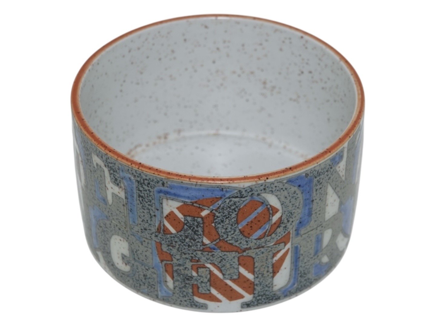Royal Copenhagen art pottery, bowl with letters designed by Bo Kristiansen. This is number 99 of 500 made. Factory first. Diameter 11.8 cm., height 7.0 cm. Perfect condition with no chips, cracks or repairs.