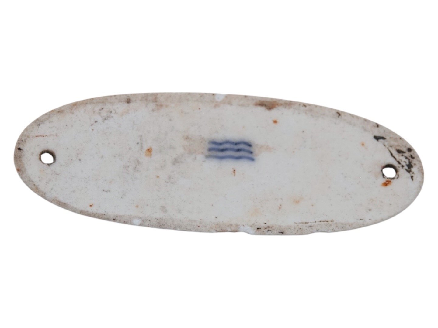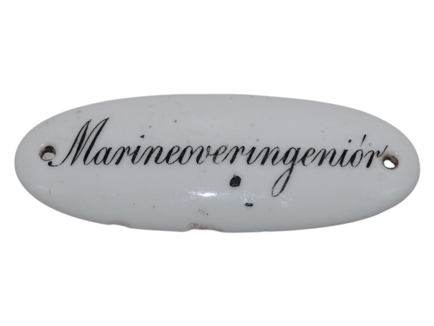 Royal Copenhagen white sign with black text: "Marineoveringenør". It was produced before 1894. Factory first. Length 12.0 cm. There are two chips, please see pictures.
