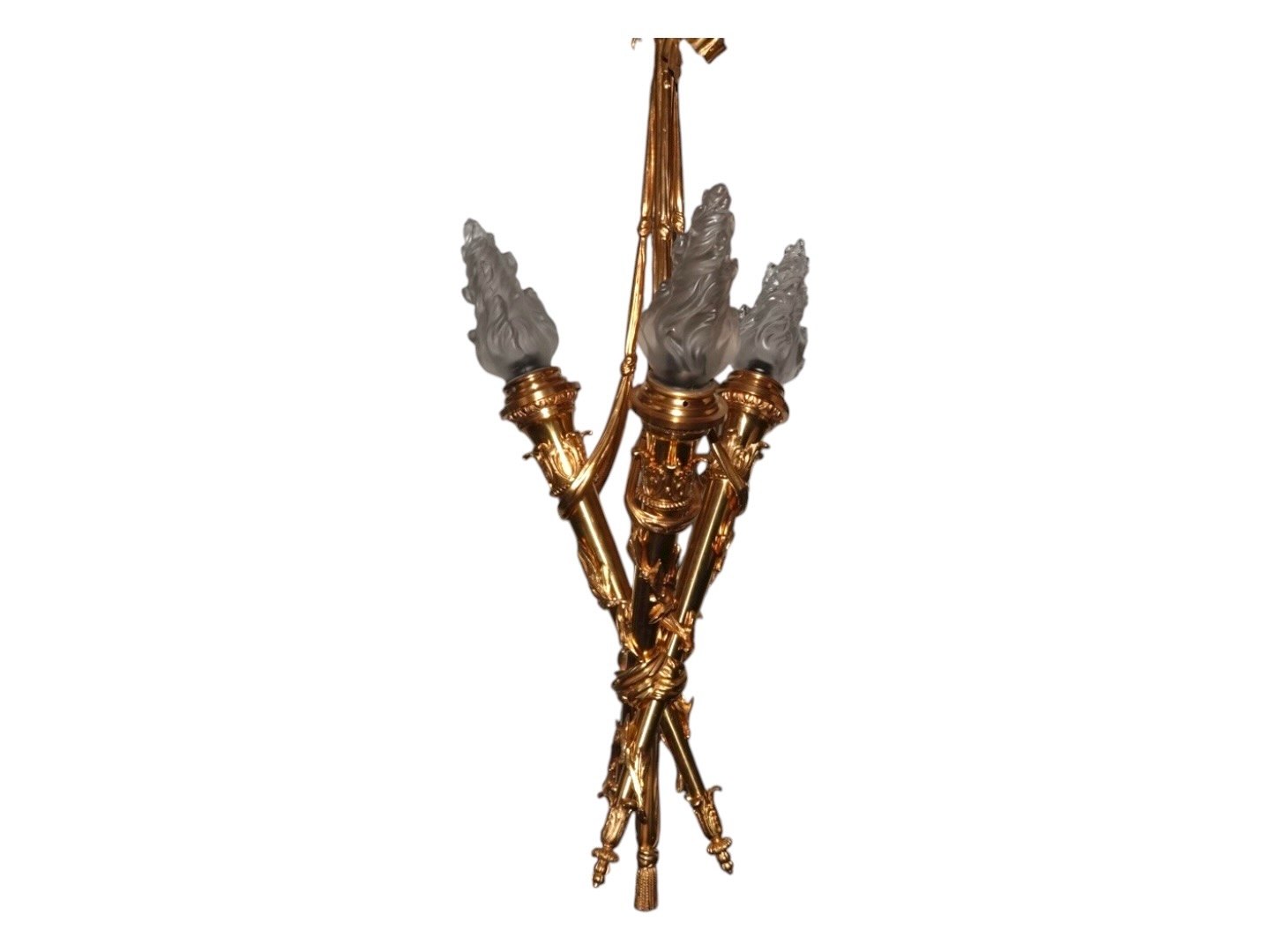 Smal lysekrone i empire stil. Den er i massiv forgyldt bronze med tre fakler og er udført i en lækker, tung kvalitet.