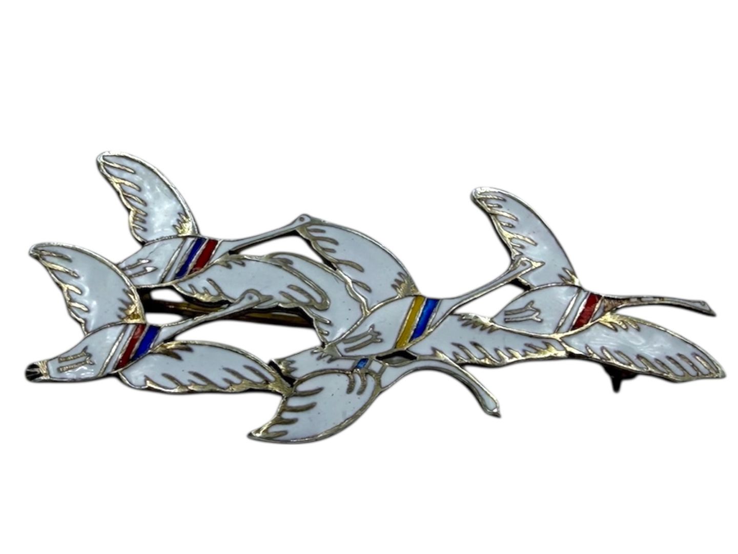 Erik Magnussen forgyldt sterlingsølv og emalje, broche med fem nordiske svaner. Stemplet "ERIK MAGNUSSEN STERLING ENERET". Længde 5,9 cm. Velholdt stand.