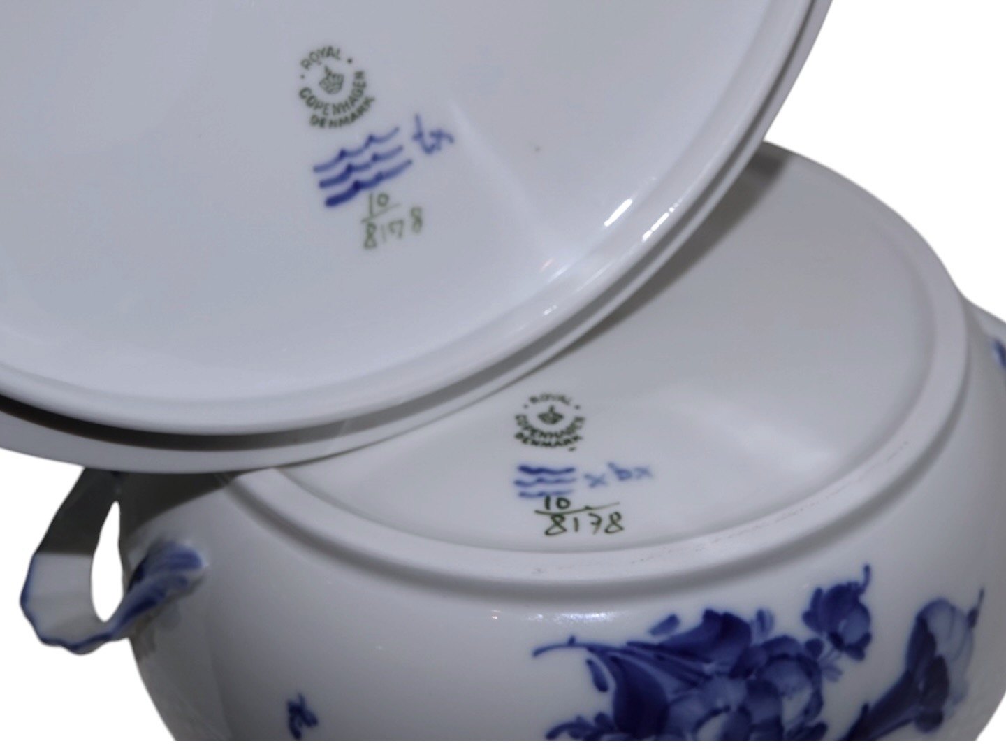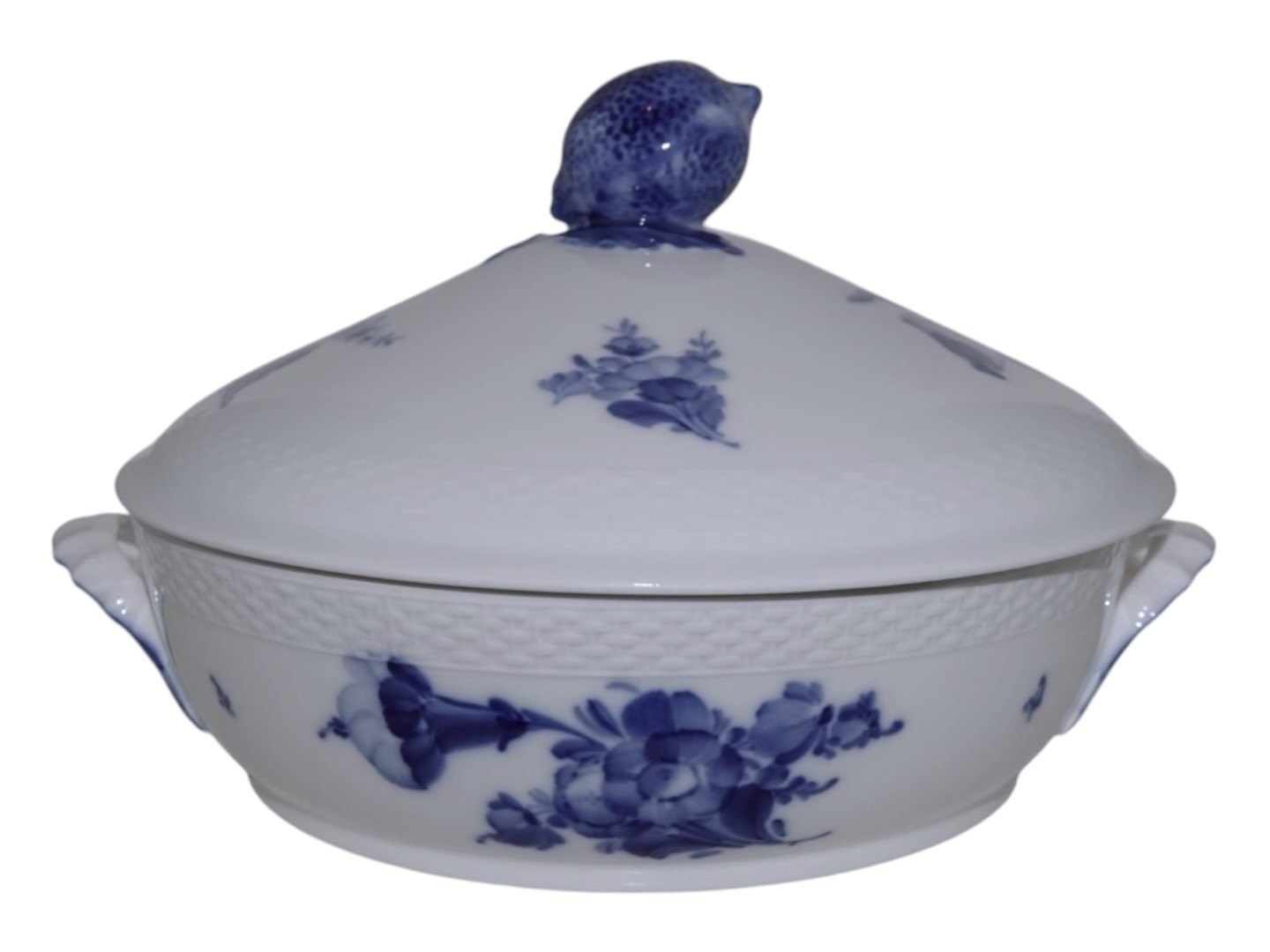 Royal Copenhagen Blå Blomst Flettet, rundt lågfad (lille terrin). Dekorationsnummer 10/8178. Underdel er 1. sortering men låg er 2. sortering. Diameter 20,5 cm. uden hanke. Perfekt stand uden fejl.