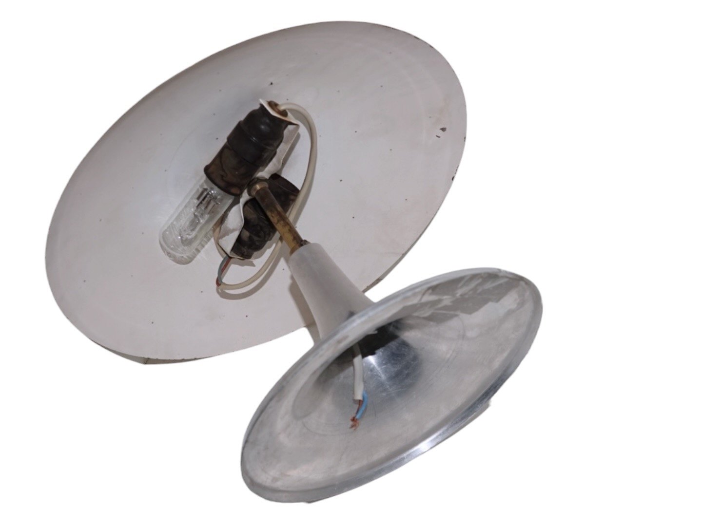 Større væglampe med messingskærm fra ca. 1960-1970. Diameter 28,0 cm., dybde 19,5 cm. Der er brugsspor/patina.