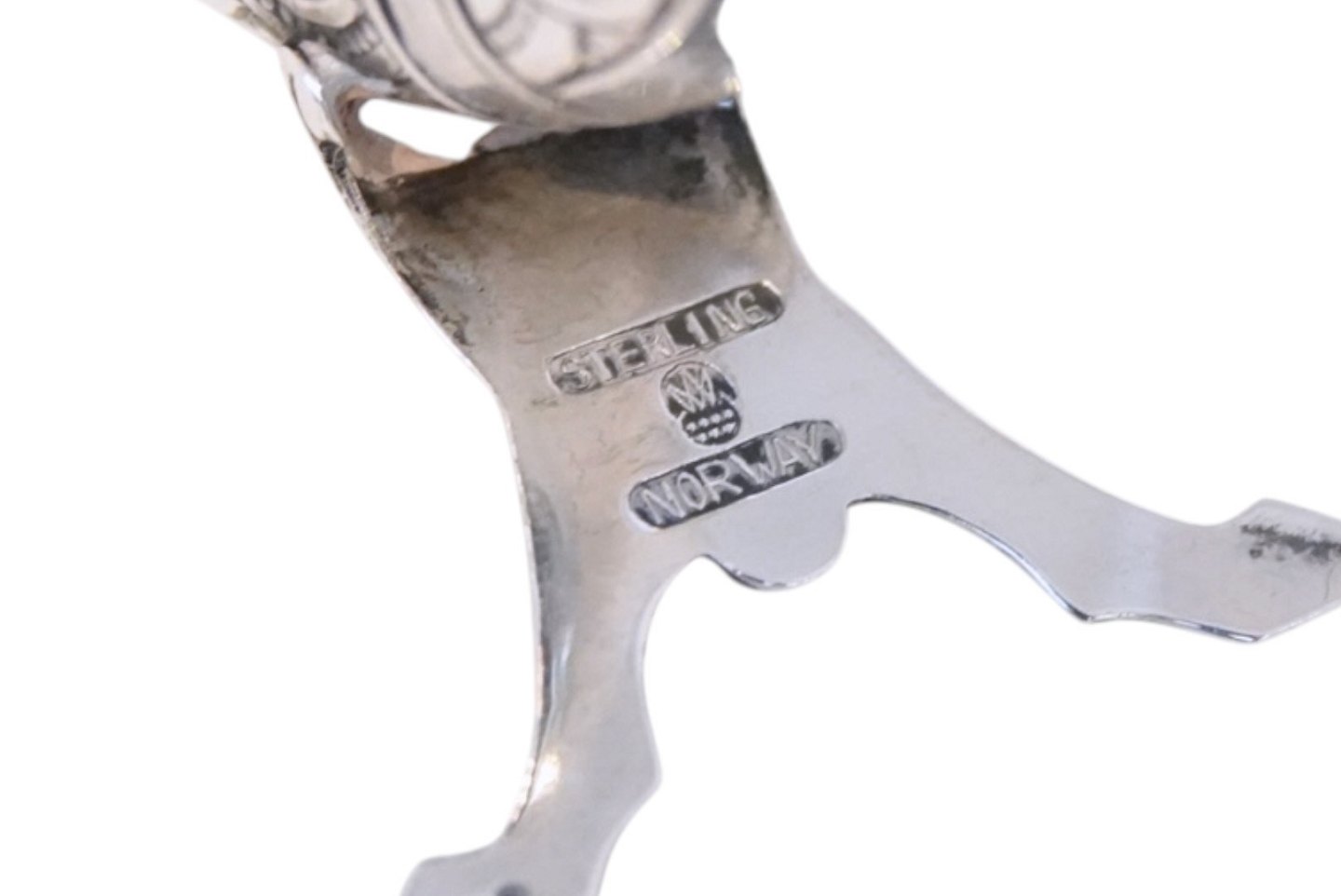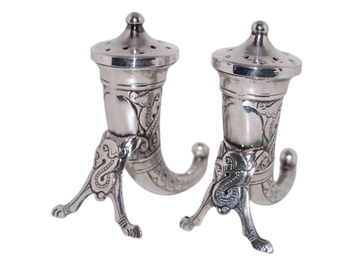 Theodor Olsen Norge, salt- og peberbøsse i sterlingsølv i form af vikingehorn.