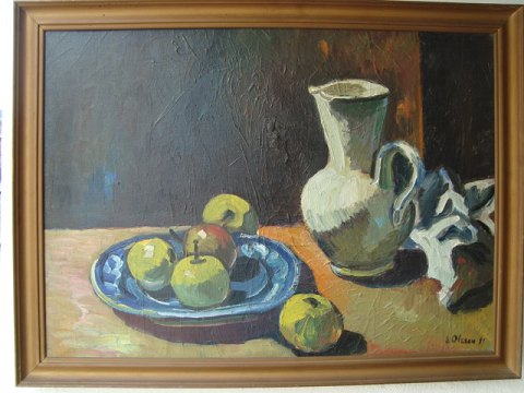 Maleri Eyvind Olesen 1941 - Opstilling med kande og frugtfad.