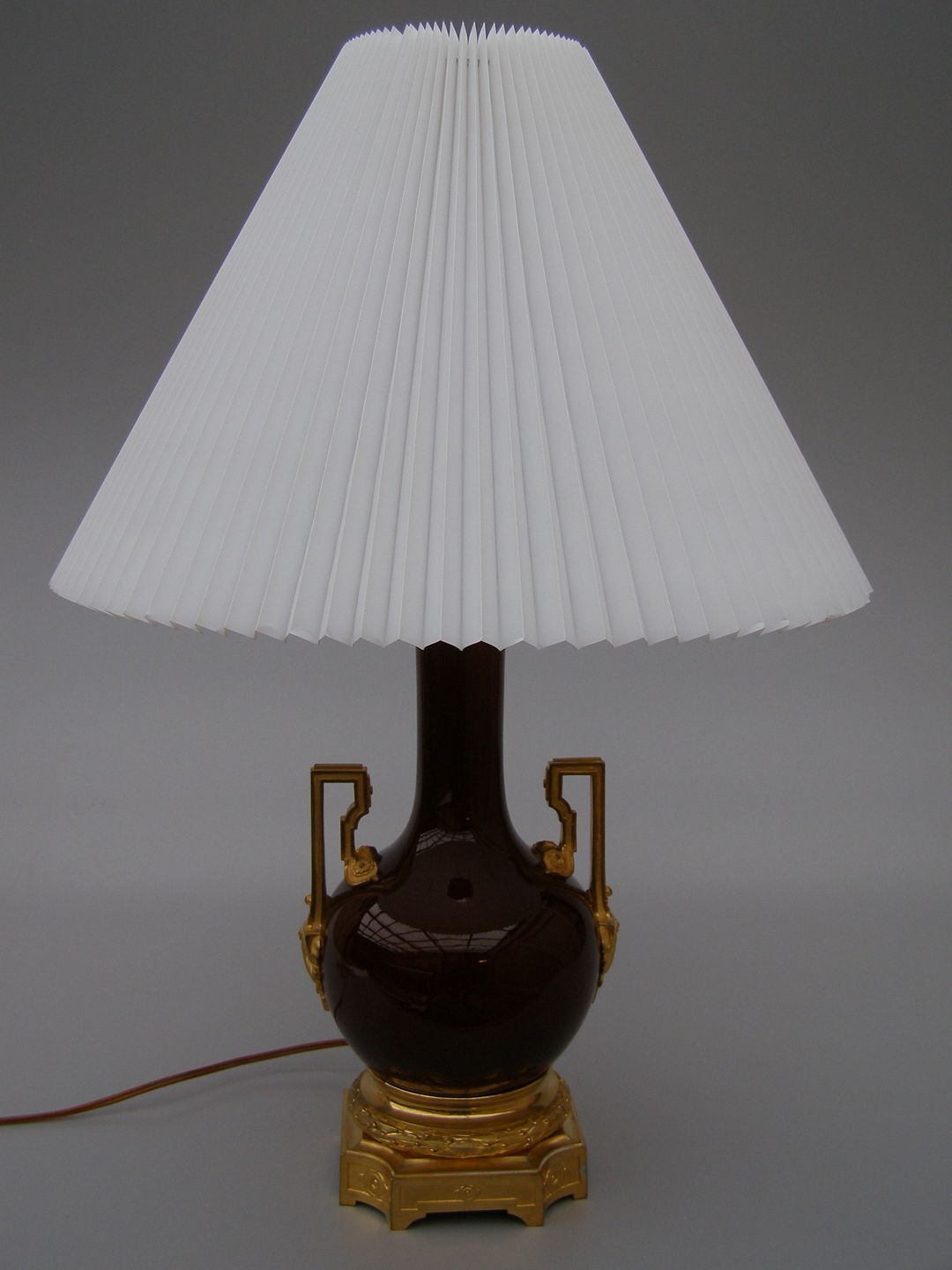 Fransk bordlampe af porcelæn med påsat broncemontering, h:64cm. med skærm