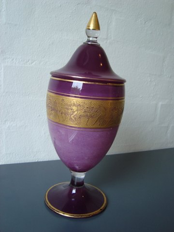 Lågpokal af lilla glas med guldfrise.