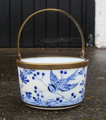 Kandisskål af blåmalet opalineglas monteret med messing hank.