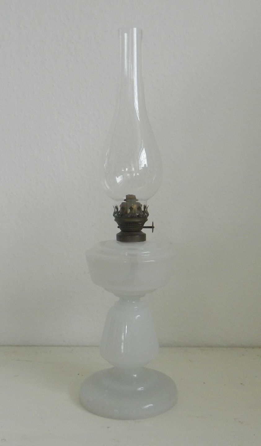 Smuk petroliums lampe af hvidt opalineglas.