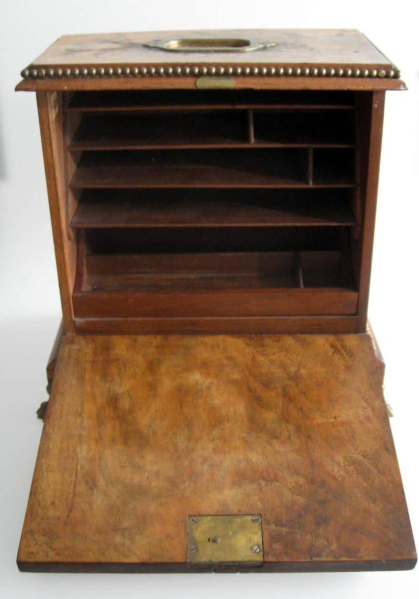 Engelsk skriveskrin, 19. årh. Valnød. Med messingmontering, løveben og hank. Med låge med dekorationer og lås. Indvendig med flere hylder og rum. H.: 29 cm. B.: 28 cm. D.: 18 cm.