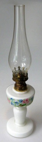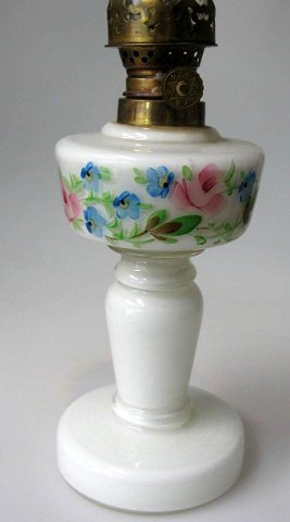 Petroleumslampe i opaline glas, o. 1900. Danmark. Med emaljedekoration i form af blomster.