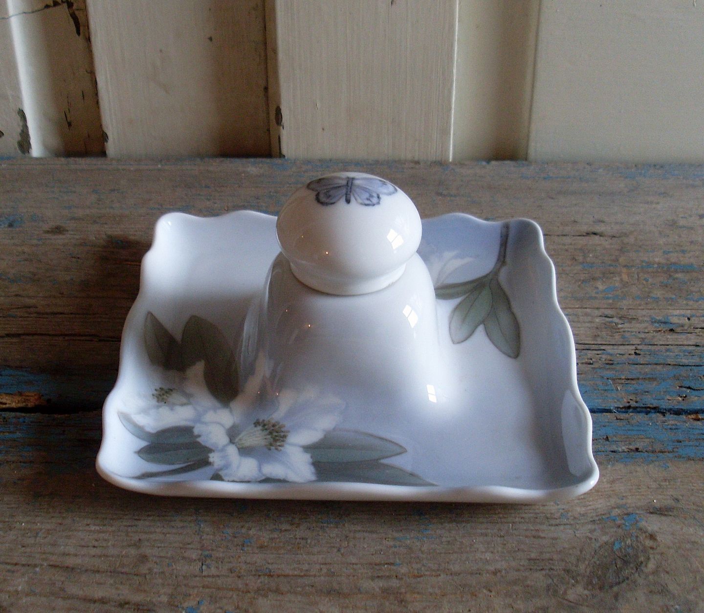 Royal Copenhagen Art Nouveau skrivesæt smukt dekoreret med blomster og sommerfugl.