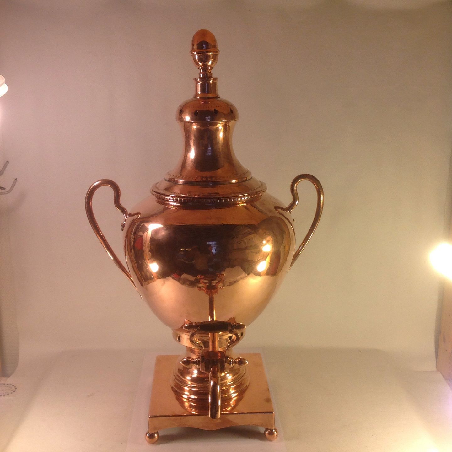 On square feet with round copper feeder. Smooth body with sisaleringer handles in copper.