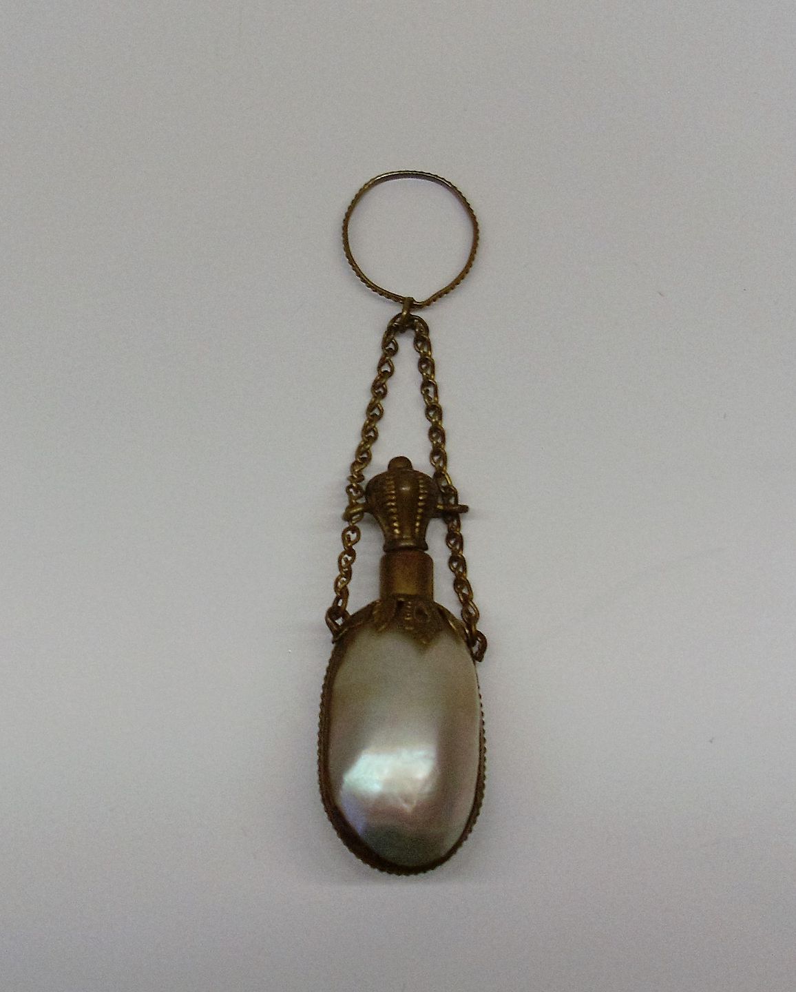 Victoriansk duftflaske i perlemor monteret med forgyldt prop og kæde.