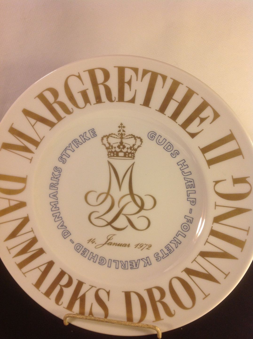Mindeplatte Bing & Grøndahl B&G 1972 Danmarks Dronning Margethe II, 14 Januar I anledning af Hendes Majestæts Dronning Margrete Tronbestigelsen. 14 Januar 1972 Diameter 24 cm.