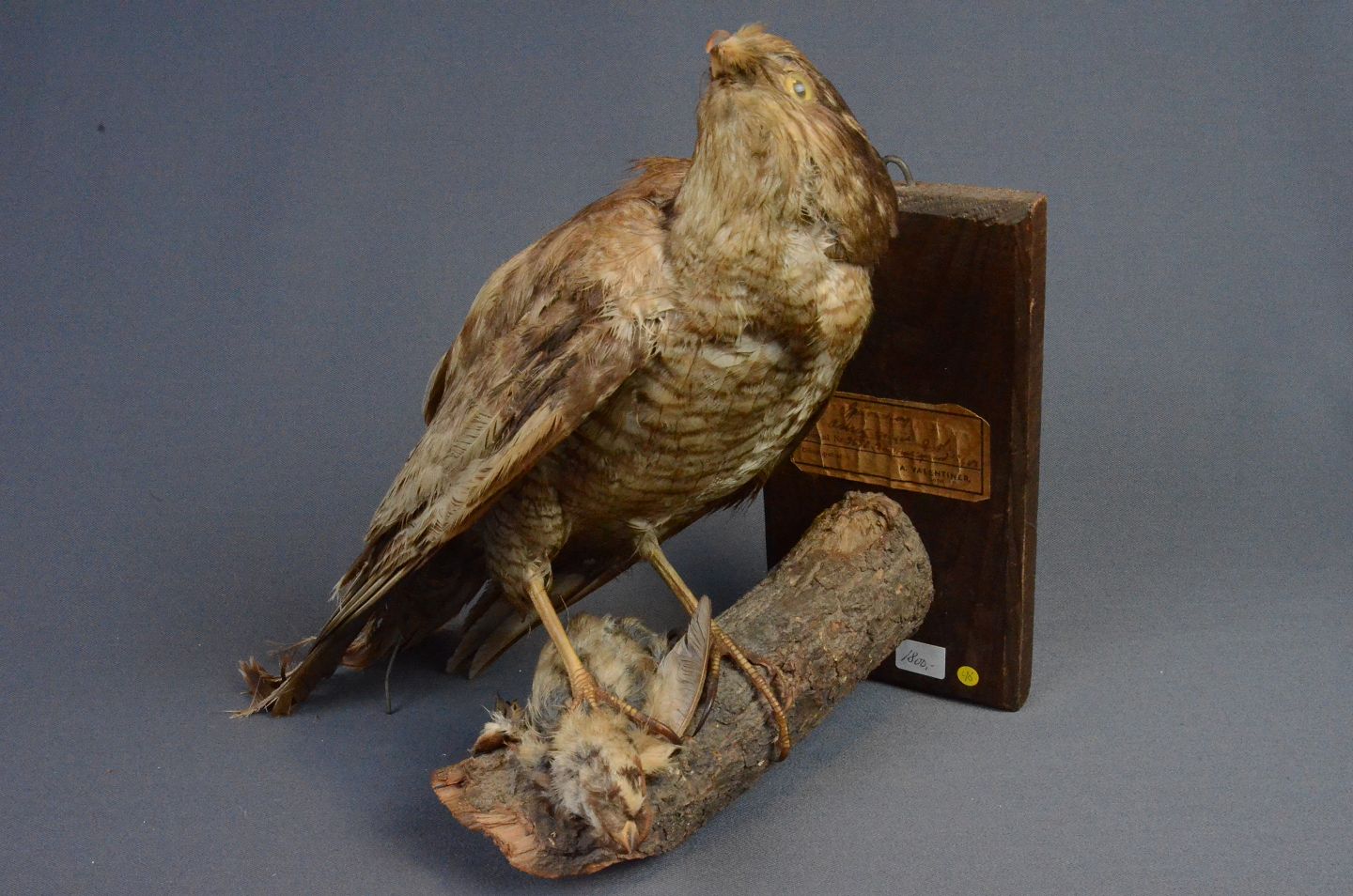 Udstoppet spurvehøg med spurv, monteret på vægophæng, h: 33 cm