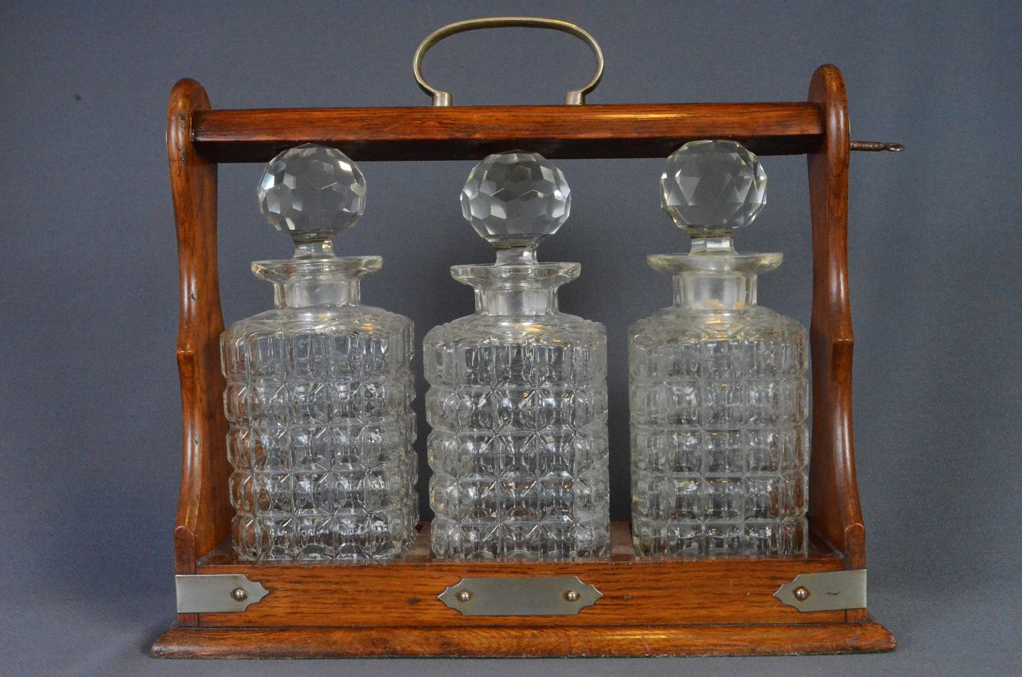Tantalus i egetræ, med tre krystal karafler, 35x31 cm