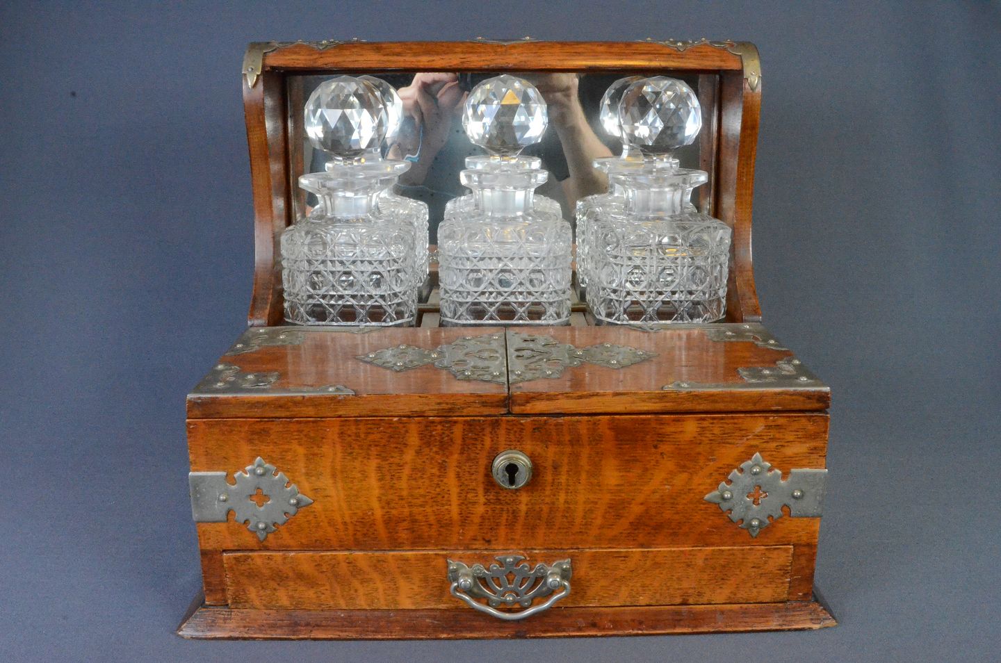 Tantalus i egetræ, med tre krystal karafler. Rum til jeton og kortspil samt hemmelig skuffe, 36x32cm, dybde 27 cm
