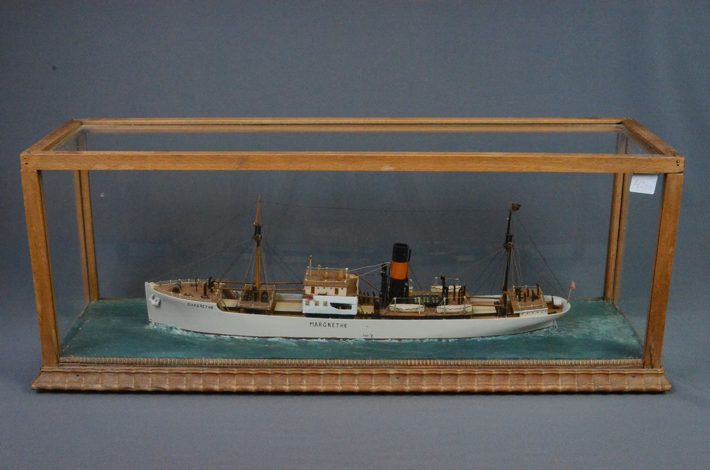 Modelskib i montre. h: 23 cm, d: 18 cm, l: 60 cm