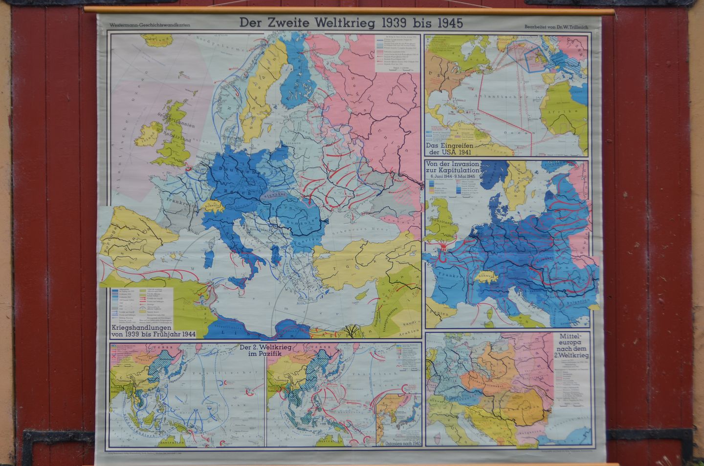 Skolekort, Tysk: 2. verdenskrig 1939-45, Transportabelt med træstokke, Kortmål: 210 x 180 cm, (skolekort nr. 9)