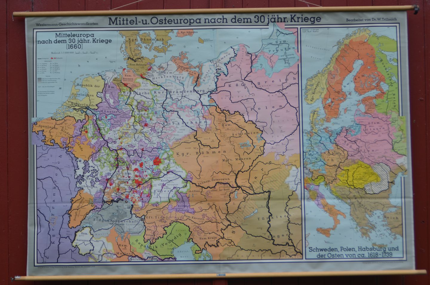 Skolekort, Tysk: Trediveårskrigen, Transportabelt med træstokke, Kortmål: 200 x 135 cm (skolekort nr. 10)