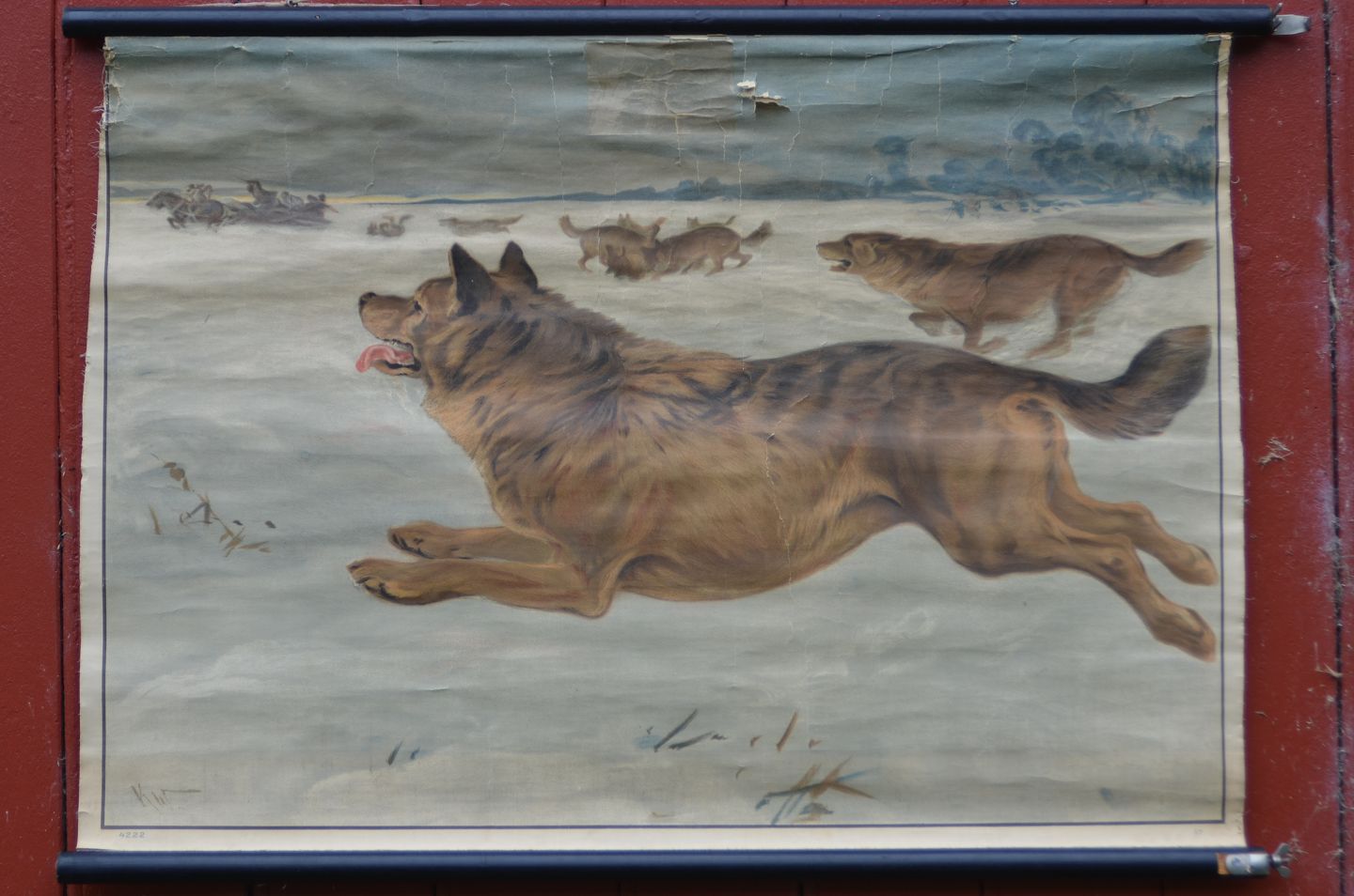 Anskuelsestavle med træstokke: Ulve, Billedmål: 62 x 84 cm, OBS: Hul i lærred! (anskuelsestavle nr. 21)