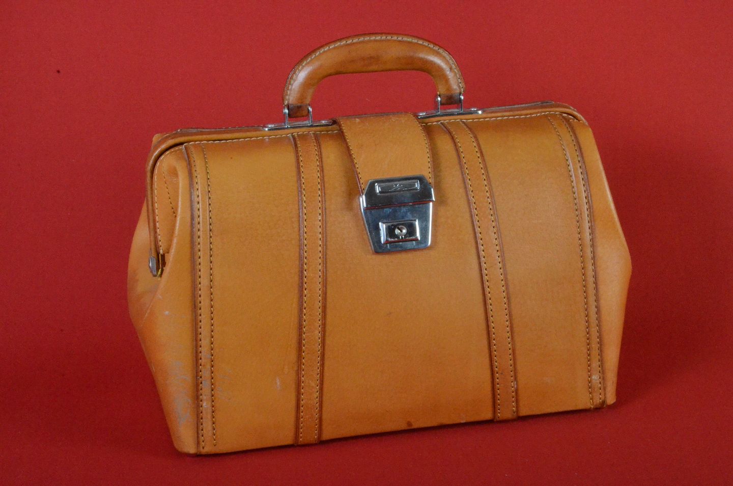 Rejsetaske af skind og stof, h: 24 cm, l: 37 cm