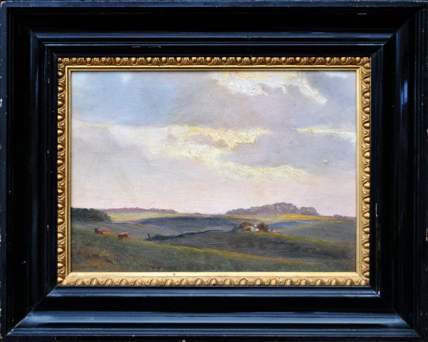 Pedersen, Viggo (1854 - 1926) Danmark: Landskab sommer aften. Skamstrup. Olie på pap/plade. Sign.: Viggo Pedersen, Skramstrup 18. 28 x 40 cm. Med sort ramme.