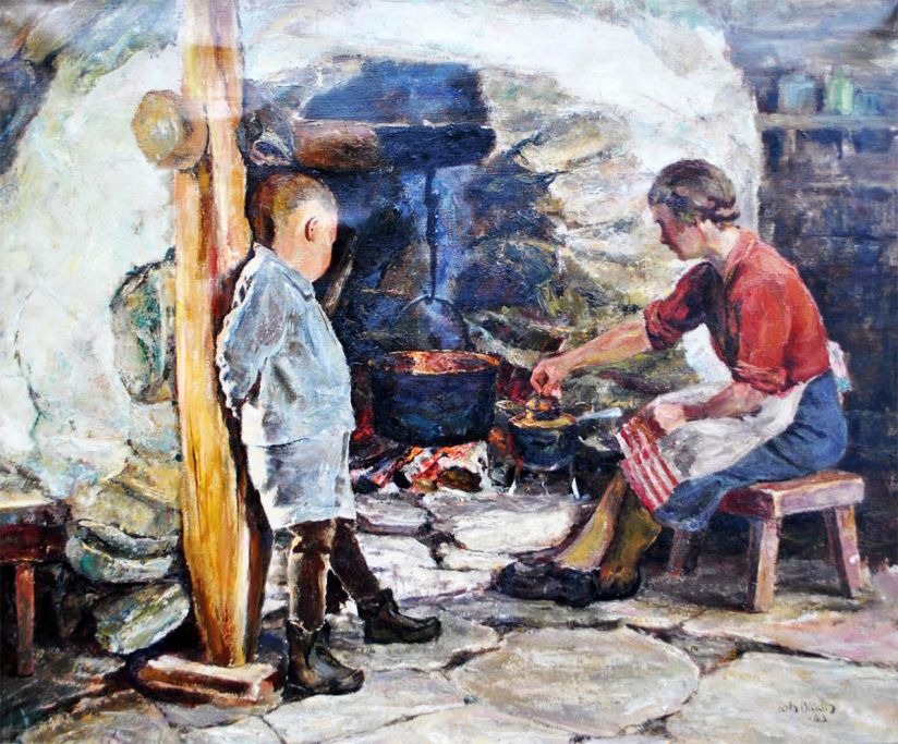 Bladh, Johan (1893 - 1976) Sverige: Moderen laver mad. Olie på lærred. Signeret: J. Bladh 43. 59 x 72 cm.