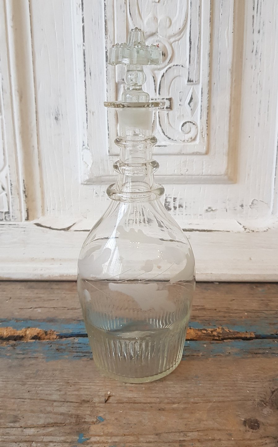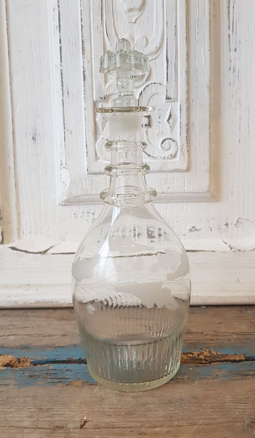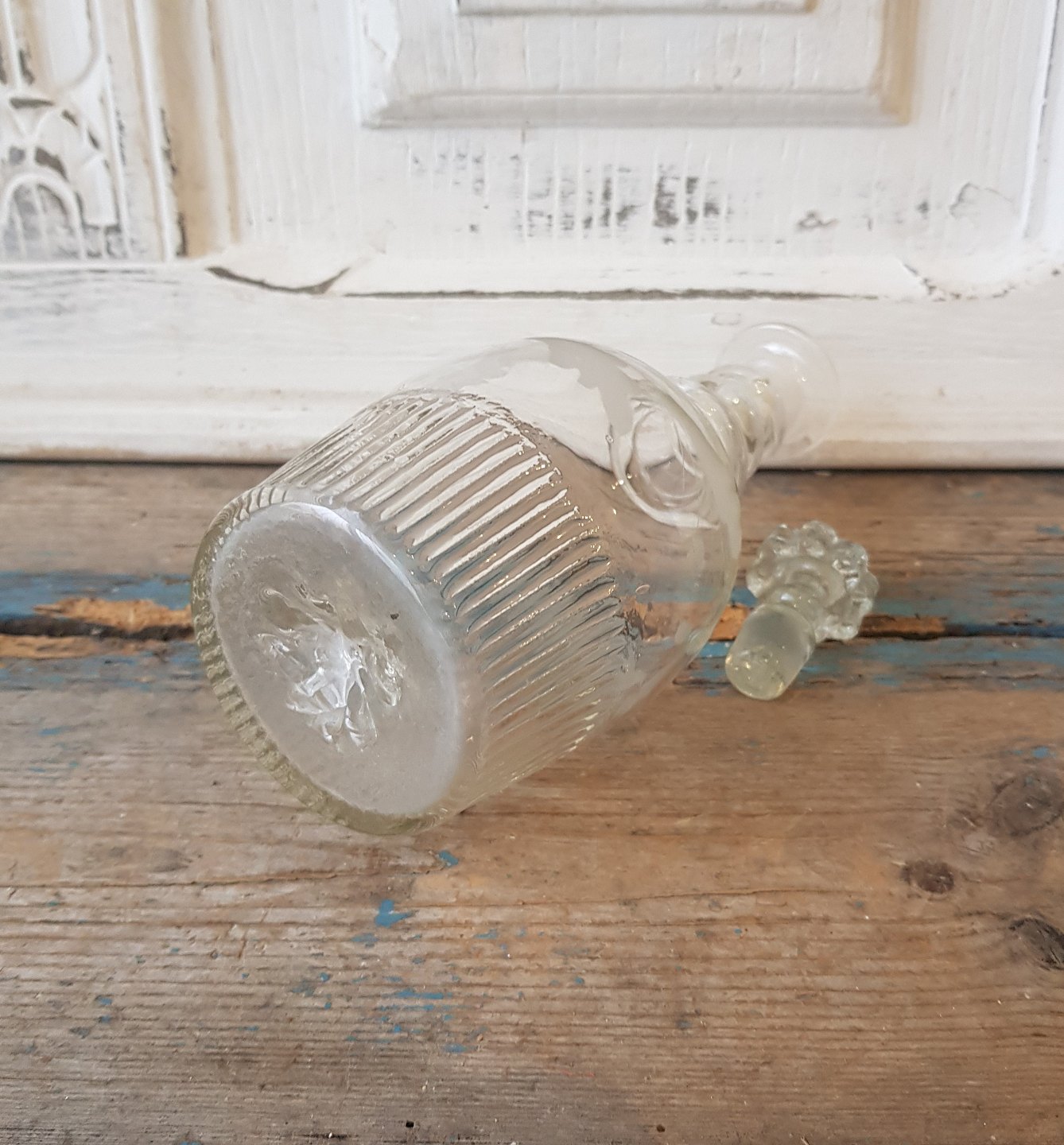 1800tals lille egeløvs karaffel - fastblæst riflet bundparti, tre runde ringe om halsen, indboret for presset prop. 8-oddet stjerne i bunden.