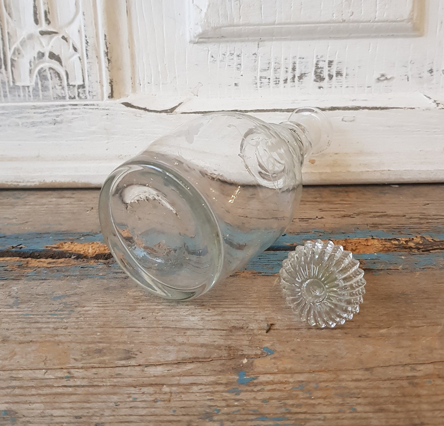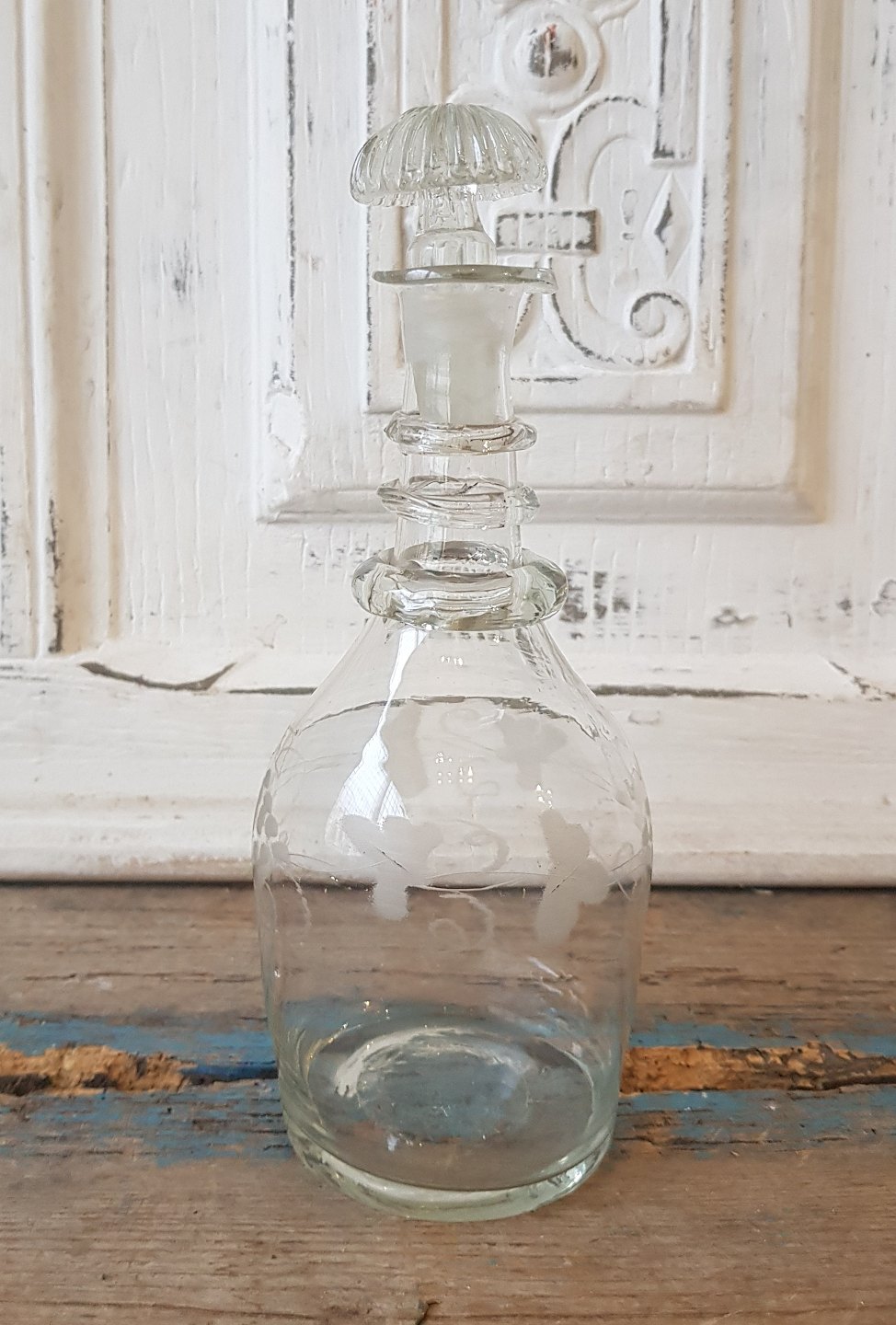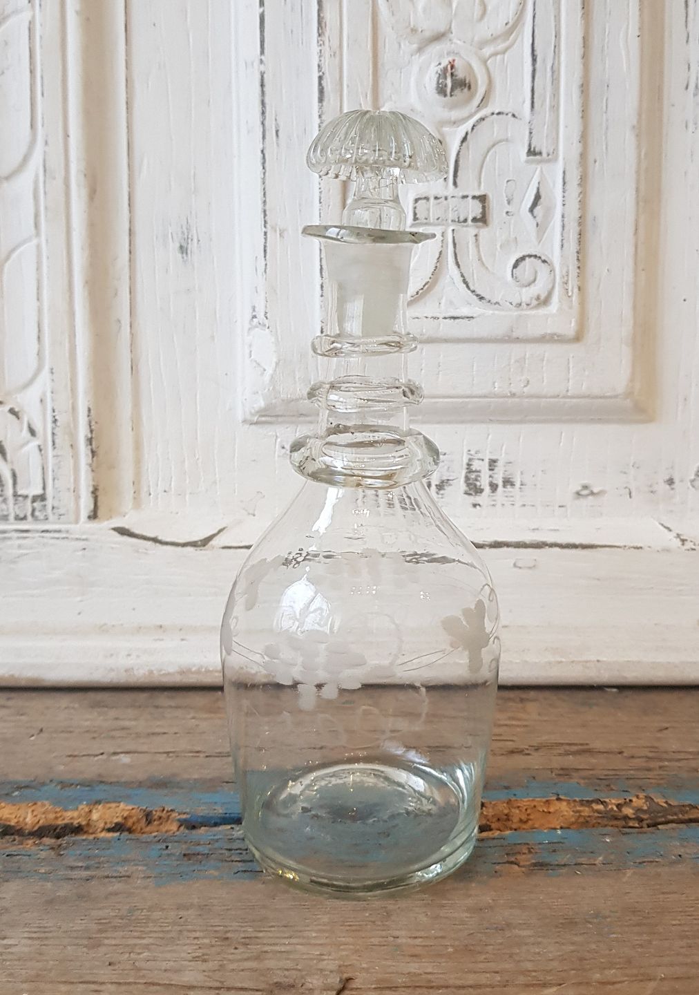 1800tals lille karaffel dekoreret med vinløv - tre runde ringe om halsen, indboret for presset prop.