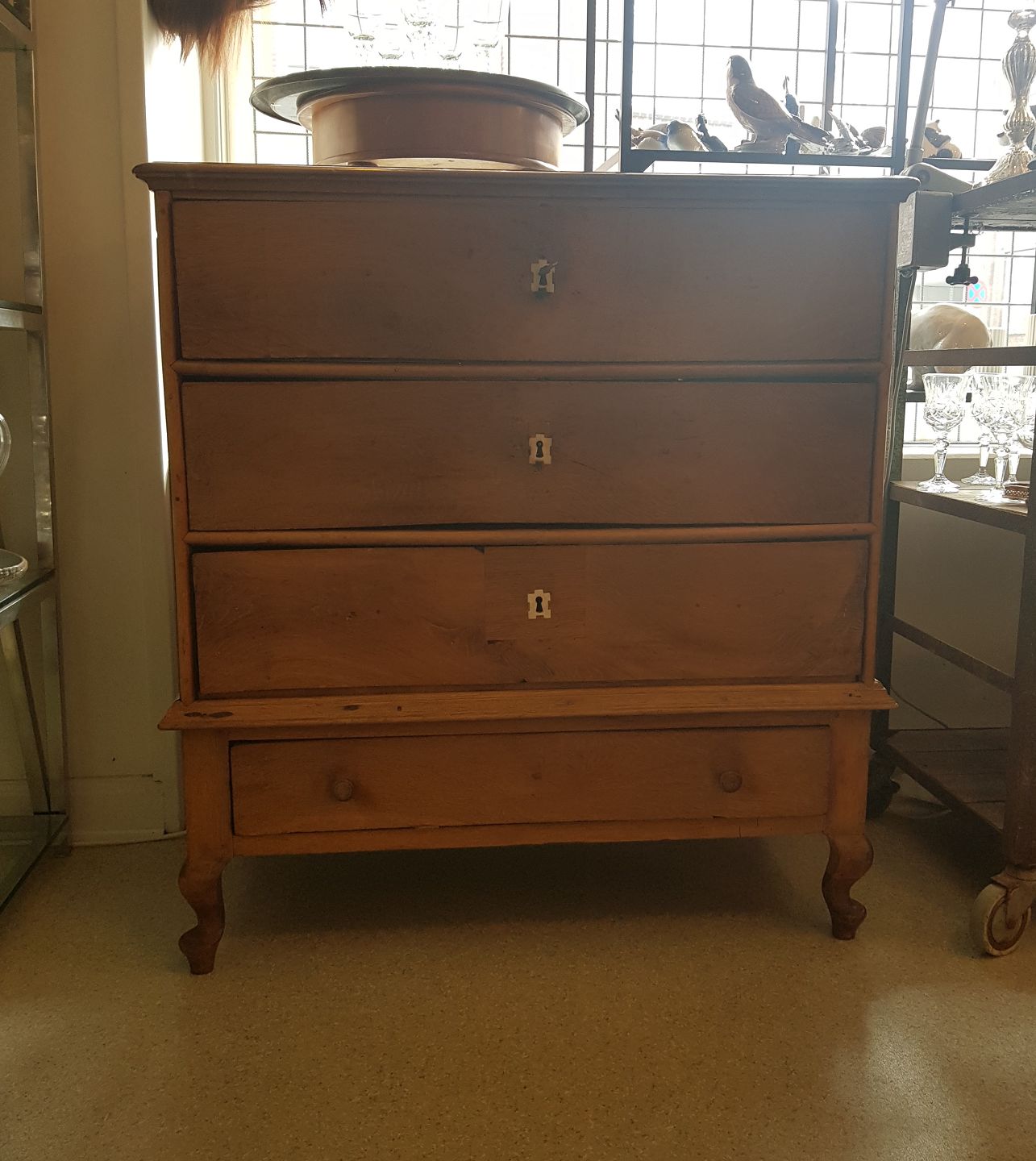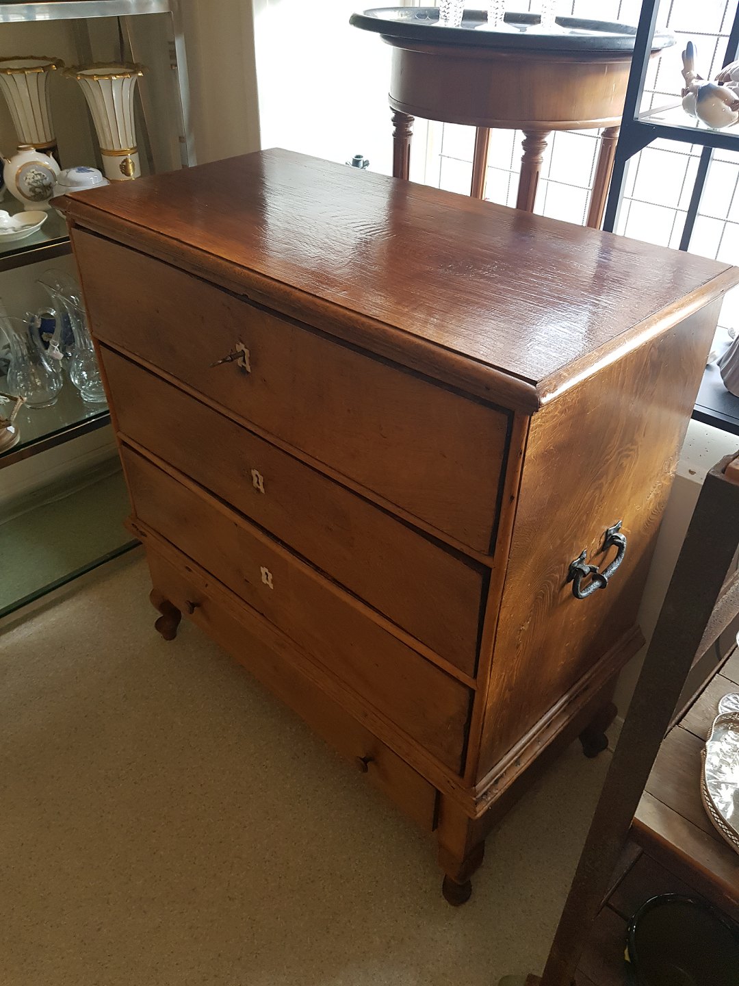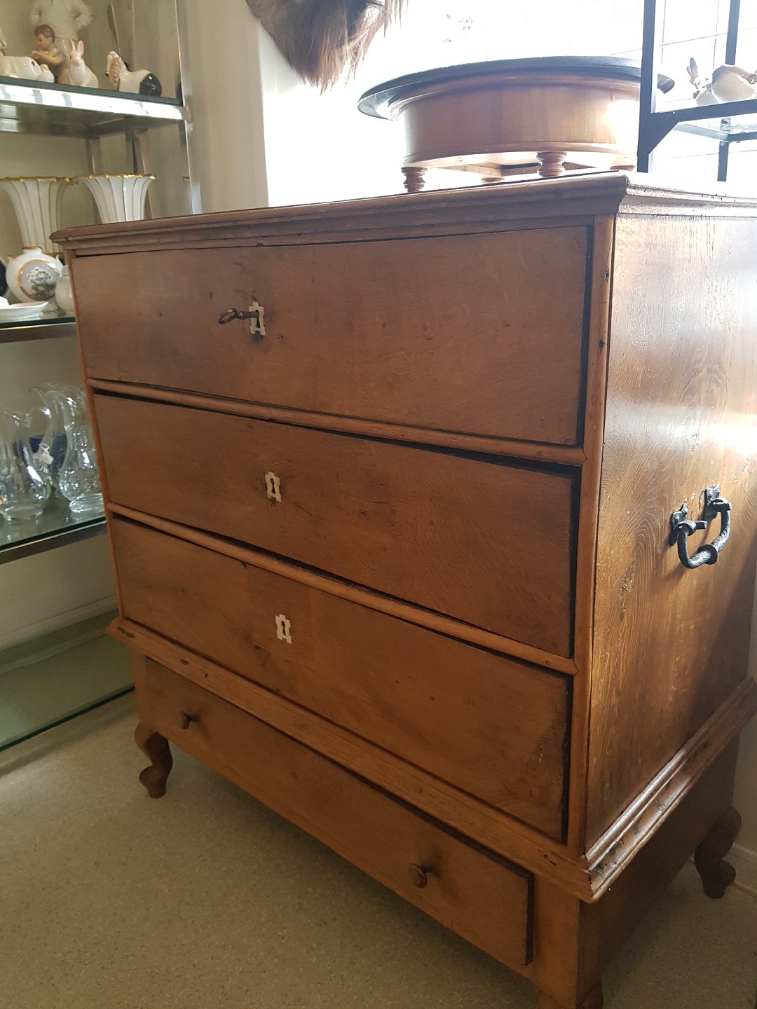 Fremstår med lakeret topplade samt manglende låsetøj i 3. skuffe.