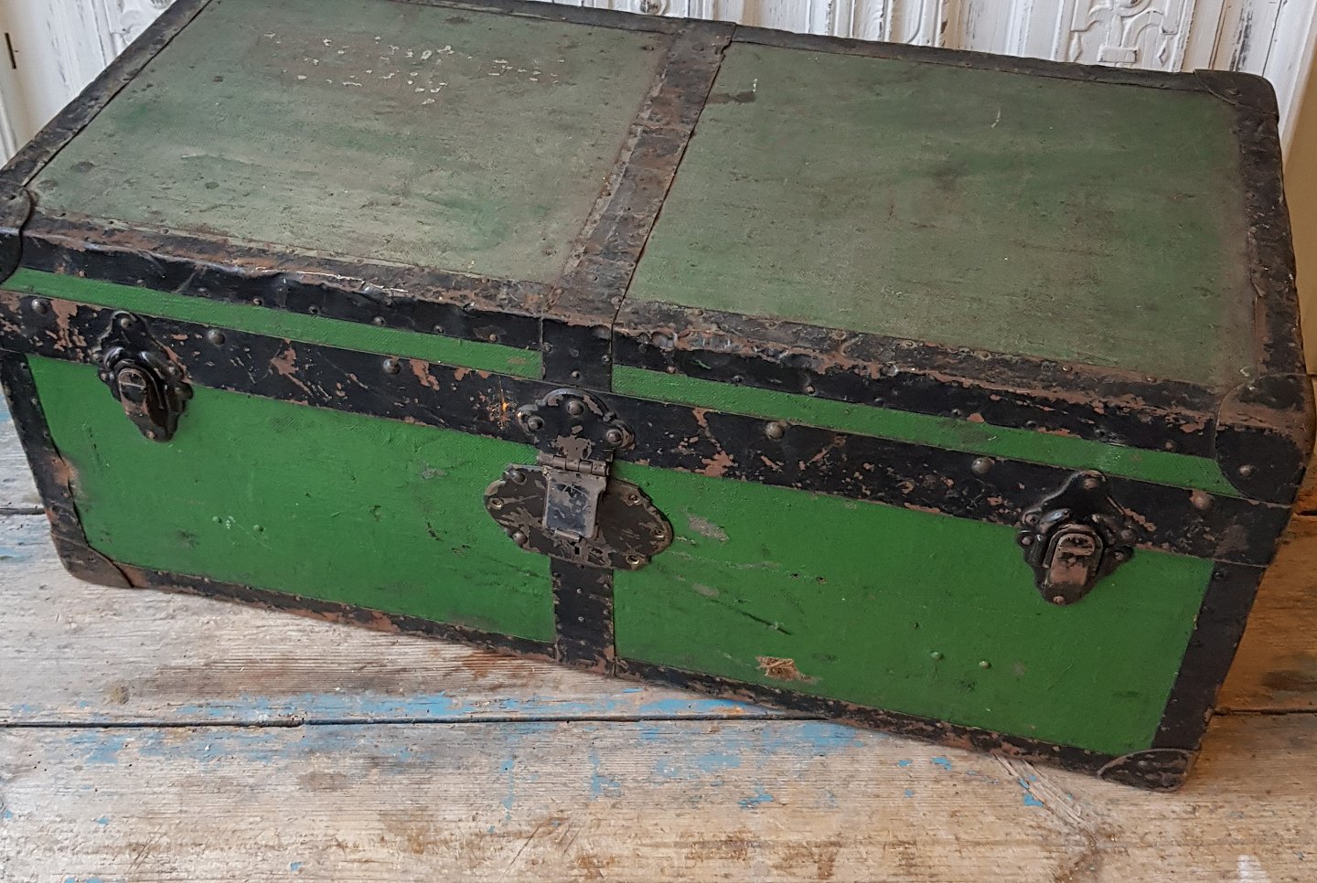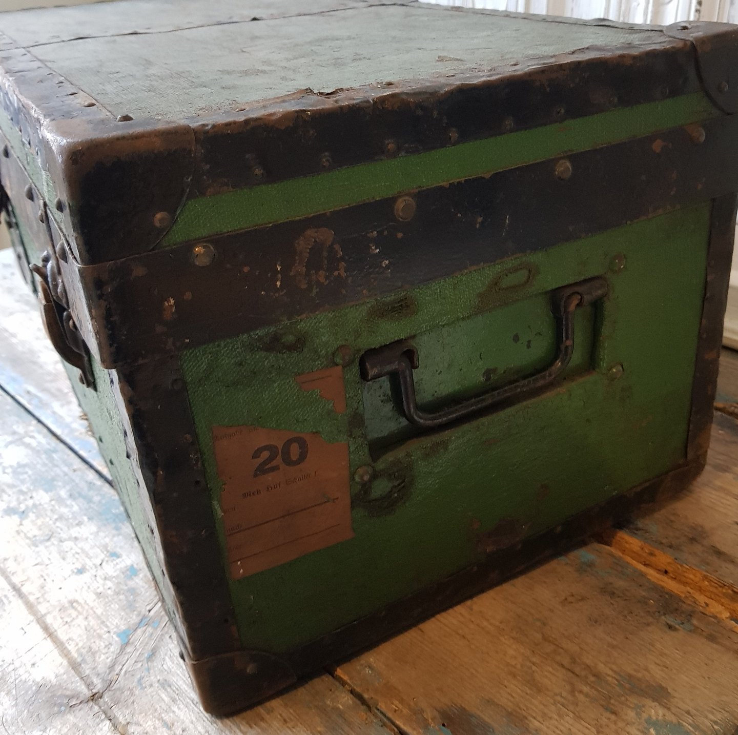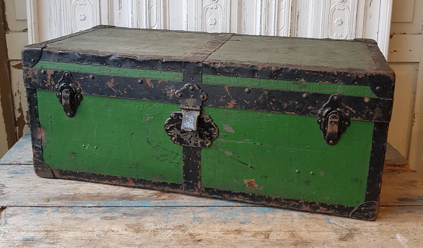 Gammel rejsekuffert med metalbeslag.